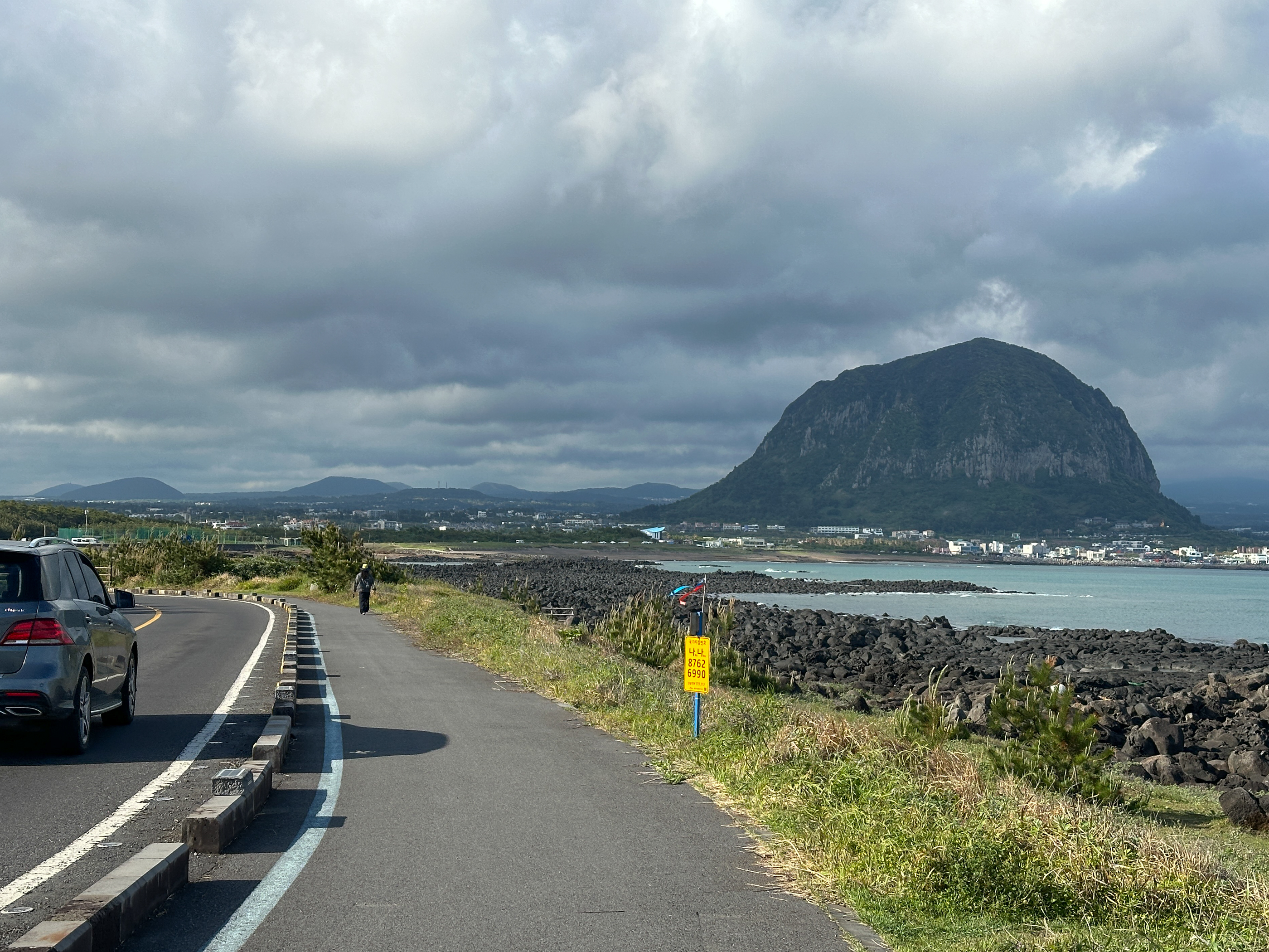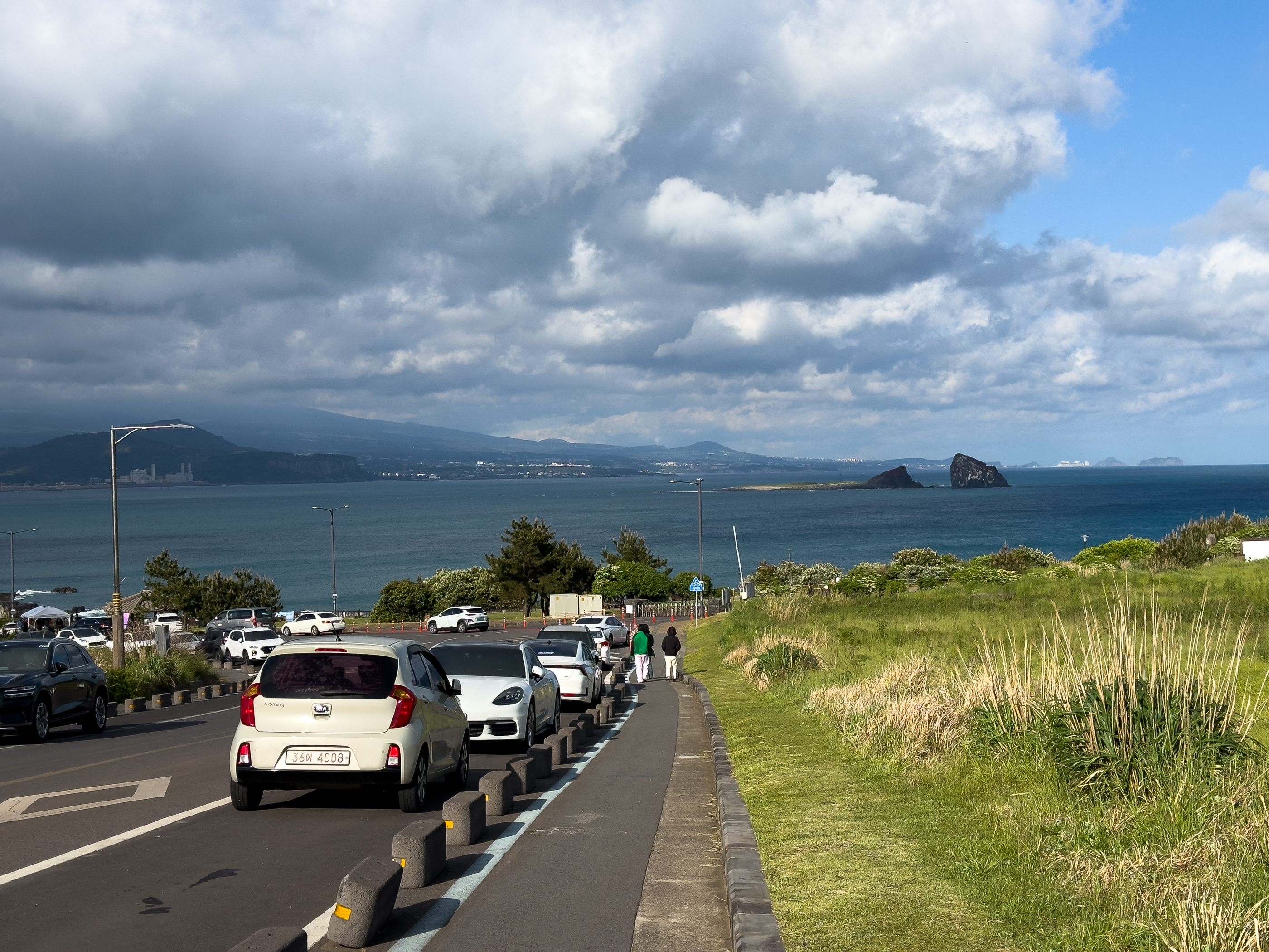 송악산입구에는 갓길에도 차량이 많이 주차해 있다. 형제섬이 보인다.