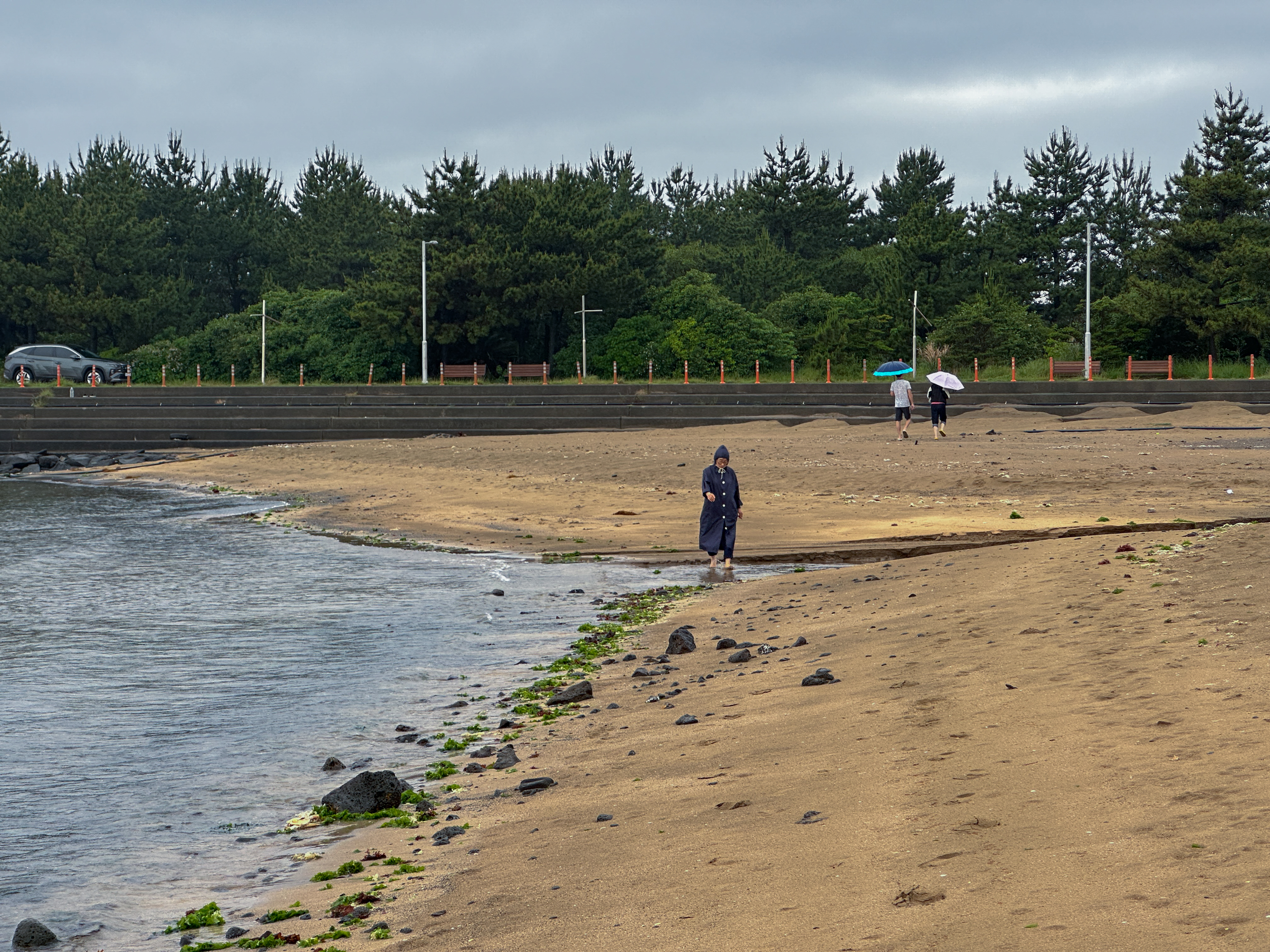오후 늦게 하모해변에 나가 우비를 입고 모래사장을 걸었다.