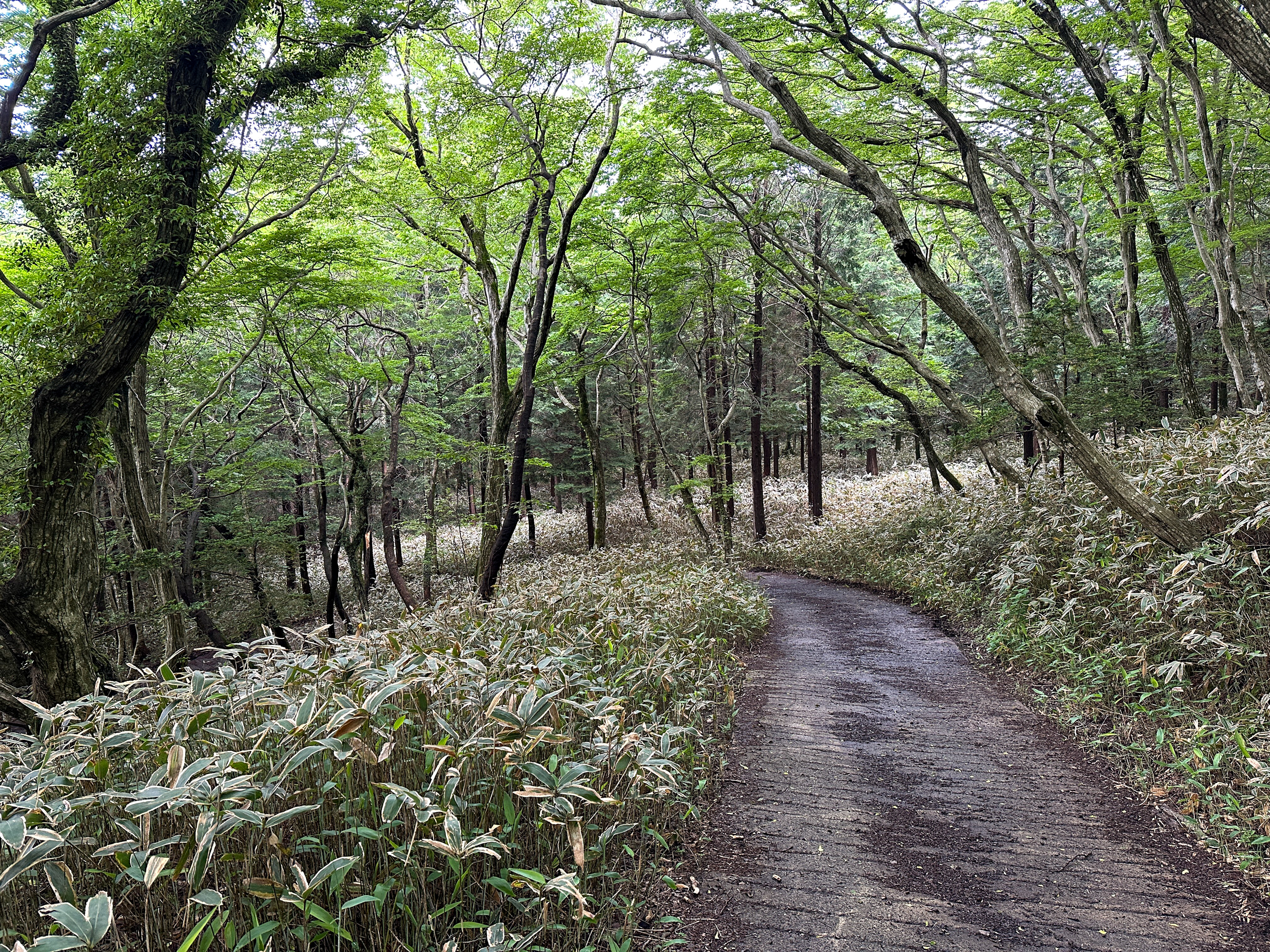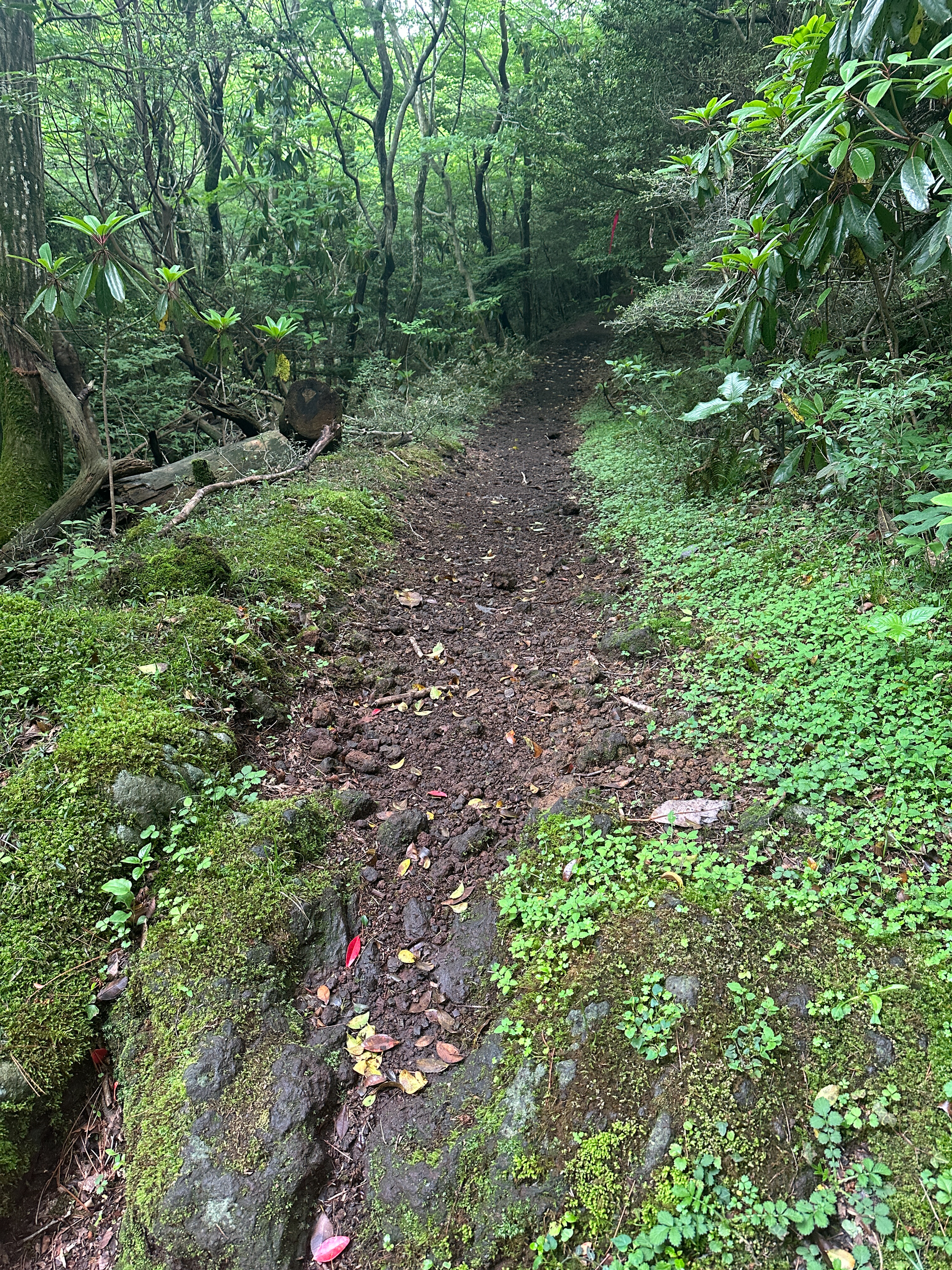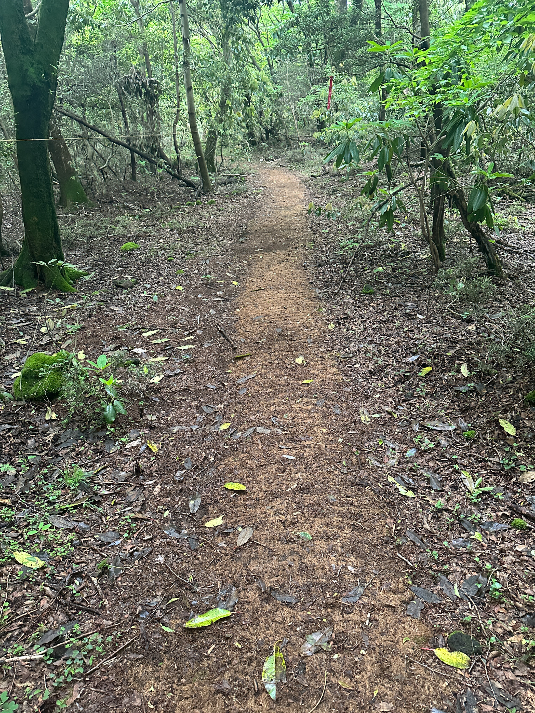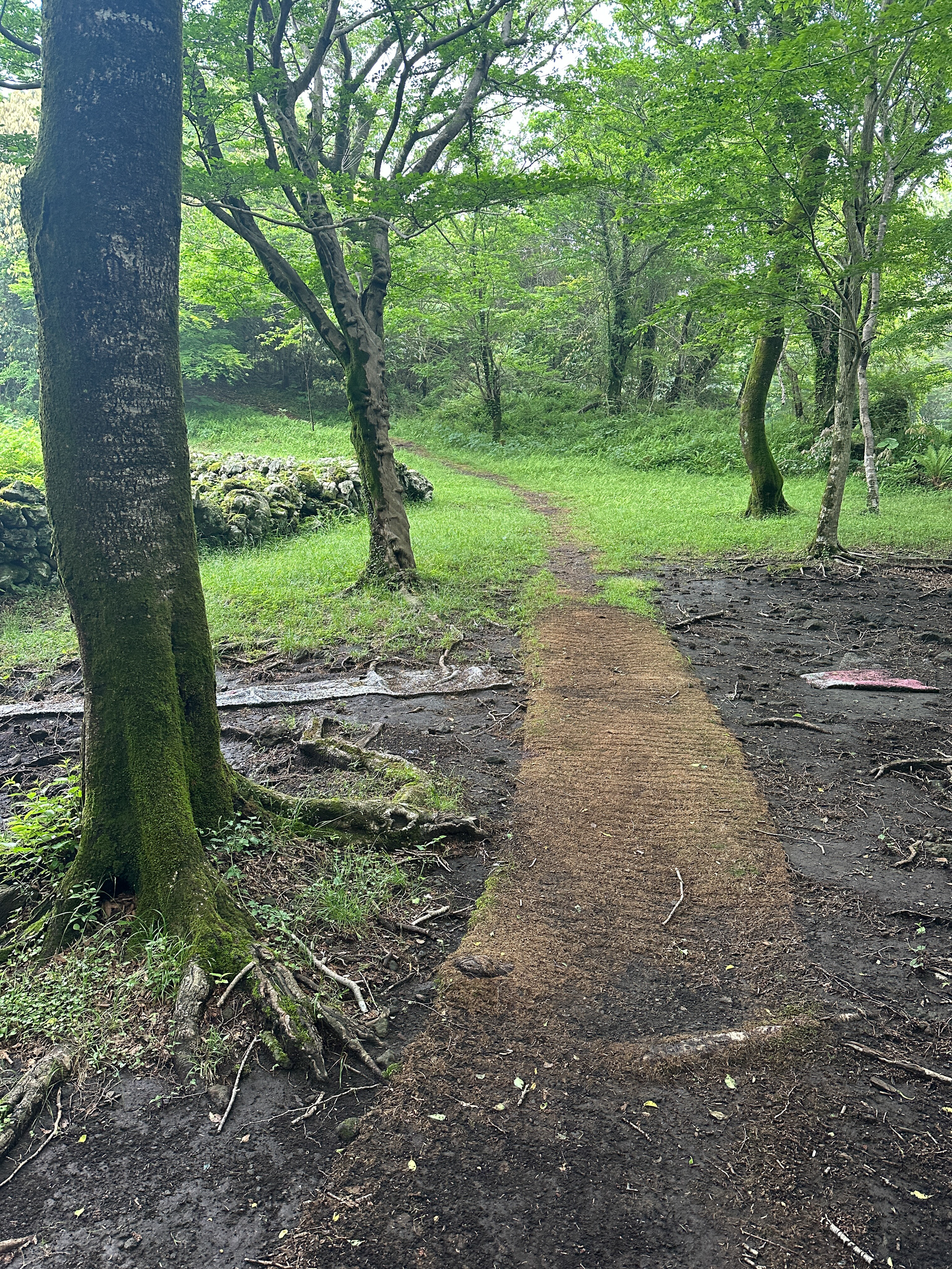 종점까지 1.2km구간이 남은 곳 부터의 숲길에는 야자나무잎 매트가 깔려 있어 걷기가 편하다.