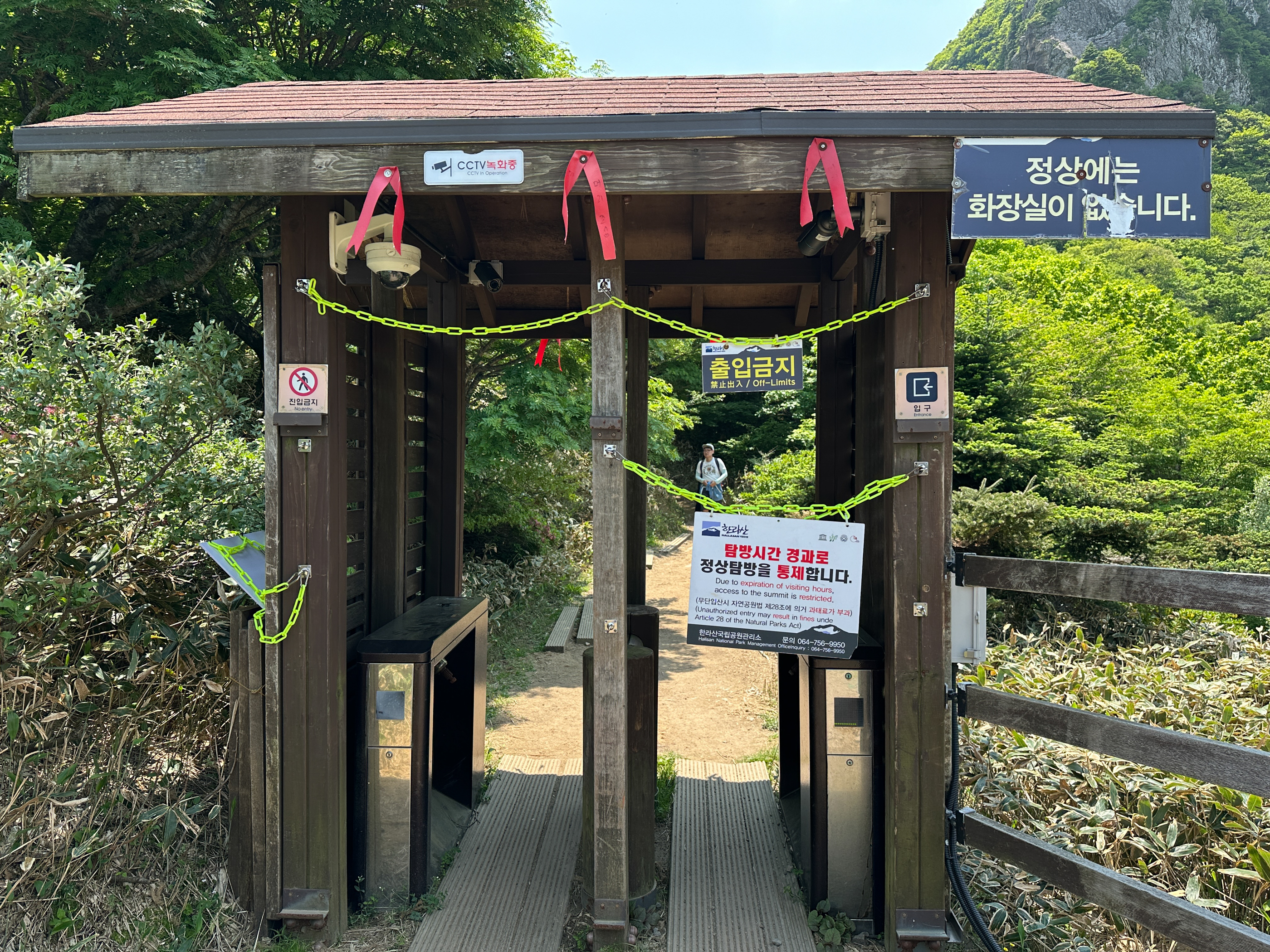 진달래밭대피소에서 정상으로 올라가는 통제소다. 12시30분 이후에는 정상 입산이 통제된다. 9시25분 통과했다.