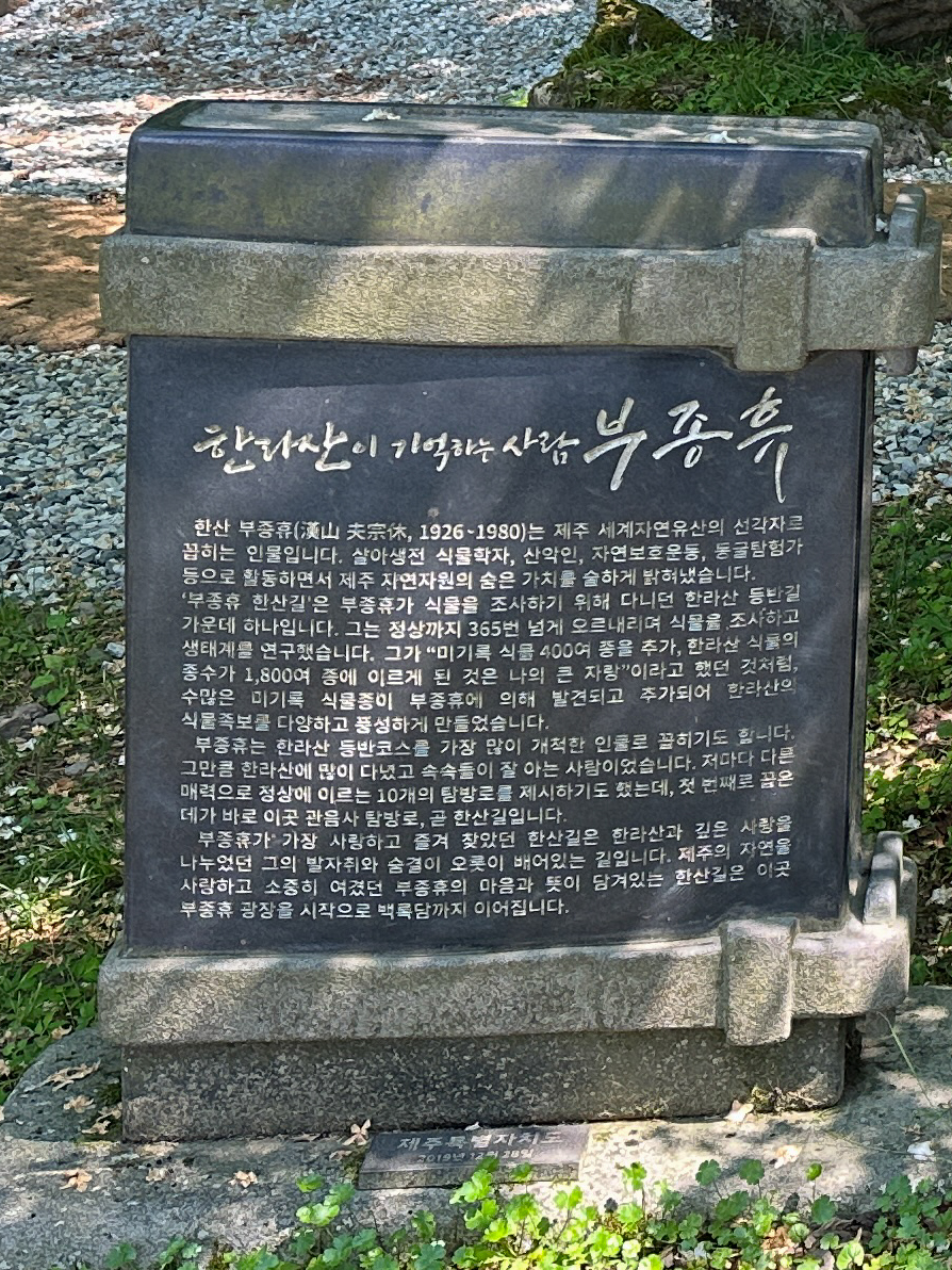 입구에 한라산이 기억하는 사람 '부종휴'동상이 있다. 특히 '관음사탐방로'를 사랑했다 한다.