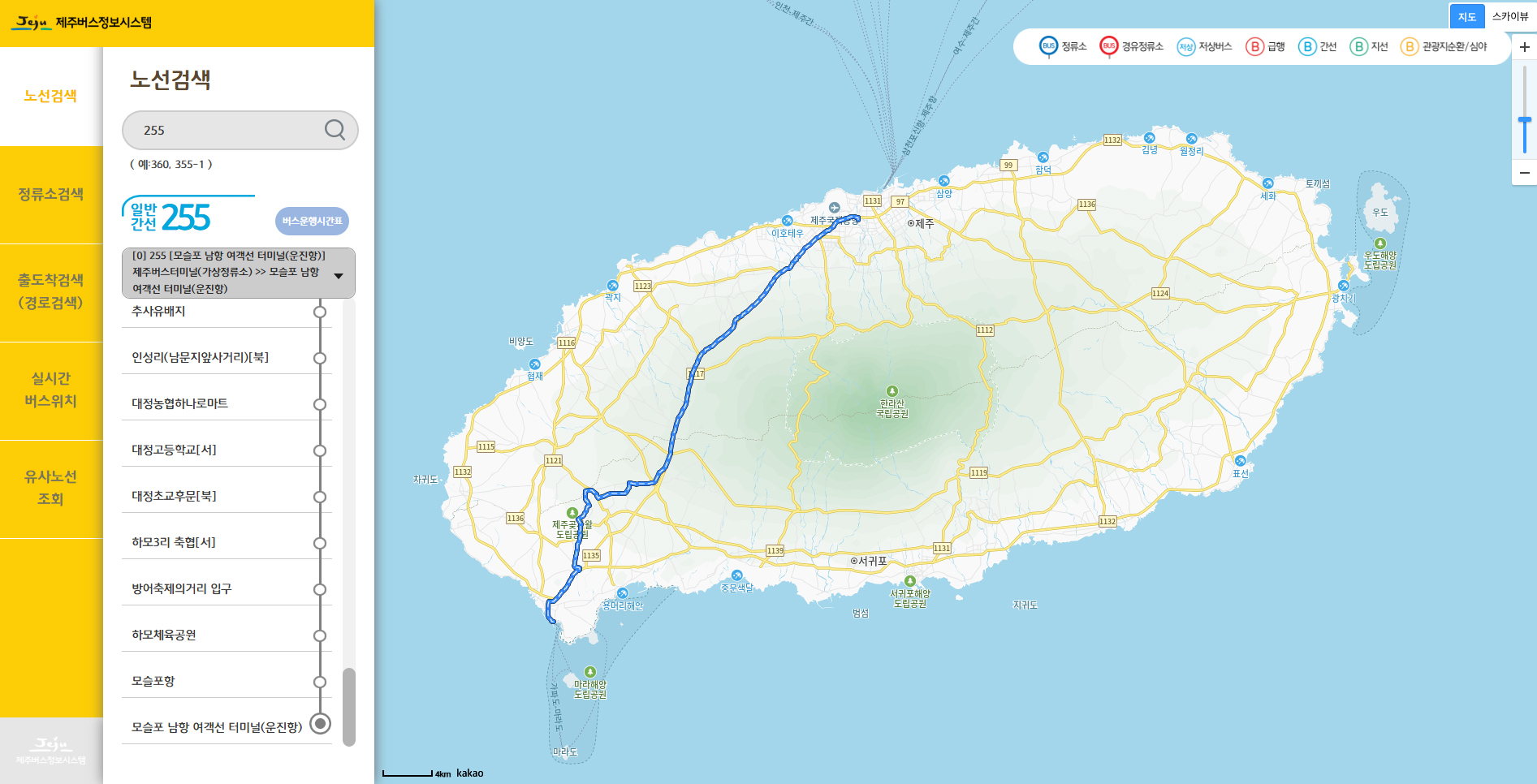갈때는사계리와 산방산, 덕수리를 거쳐 화순쪽을 돌아 동광환승정류장에서 평화로를 타는 251번버스.(1시간20분)