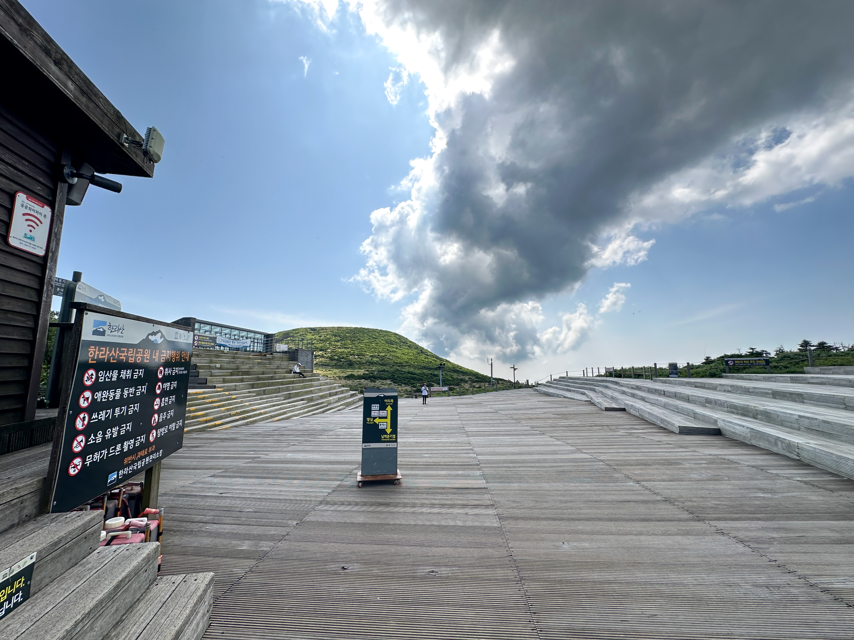 남벽분기점, 돈내코탐방로는 14시 이후 입산 통제라는 안내방송이 계속해서 나왔다. 야외 계단에 앉아 서둘러 김밥을 먹었다. 늦은 점심이다.