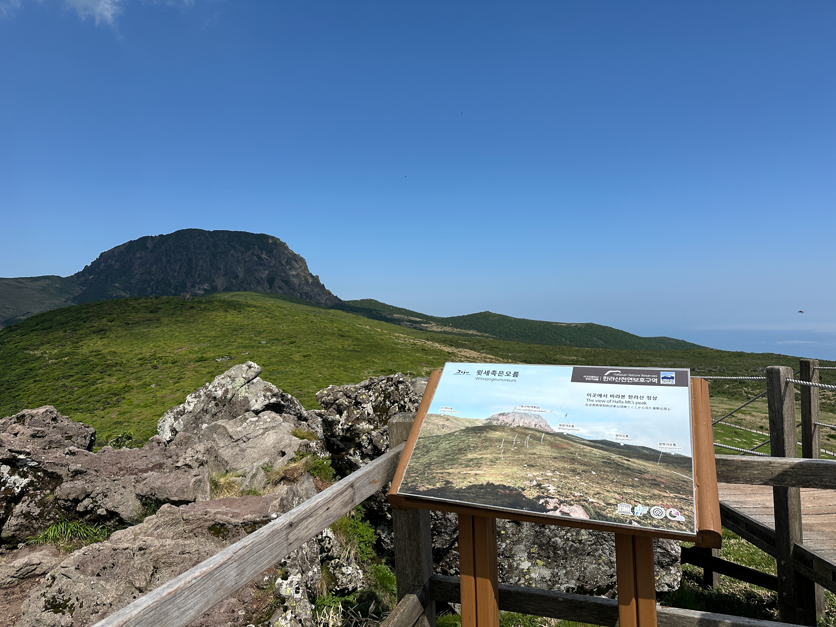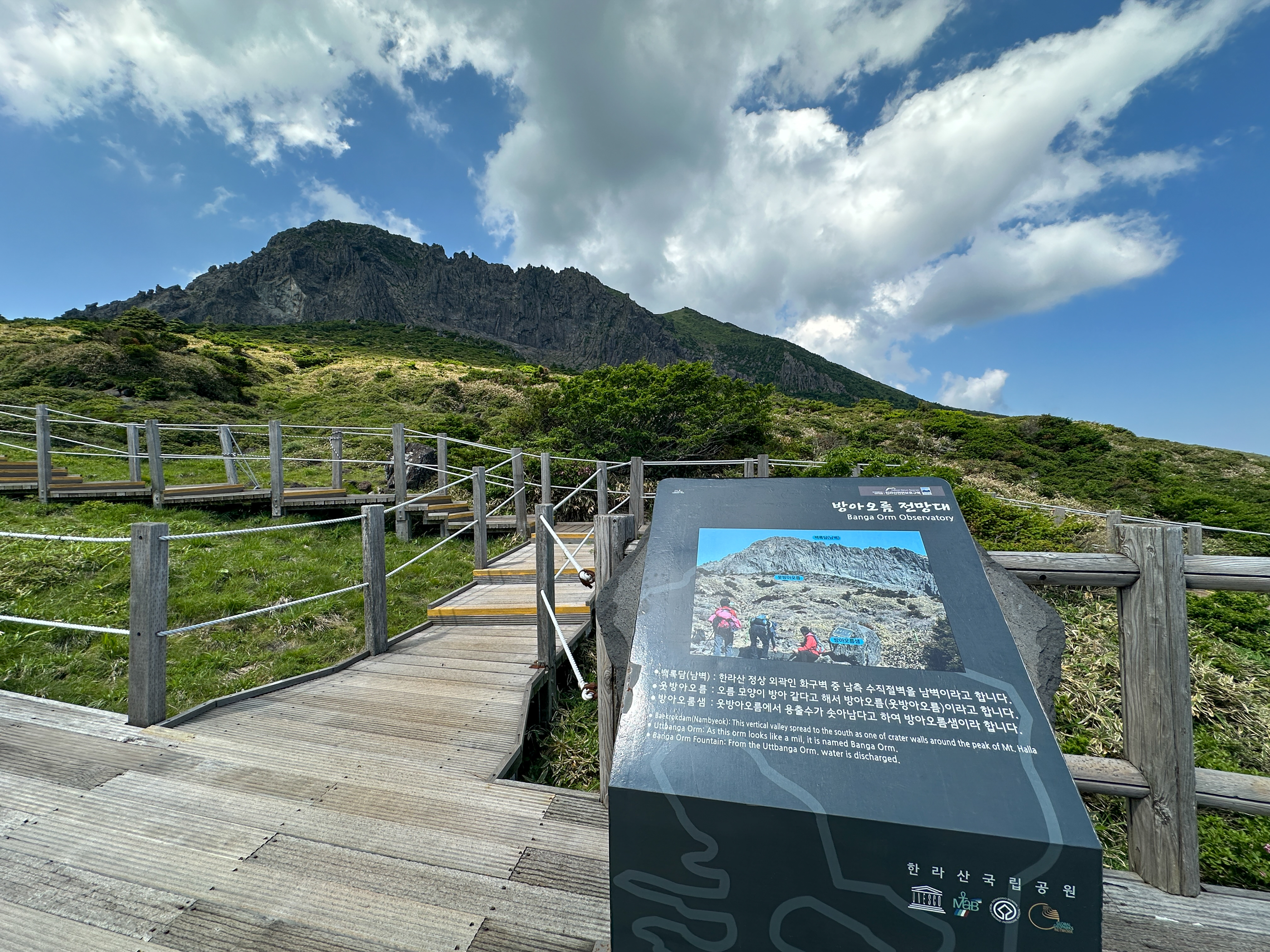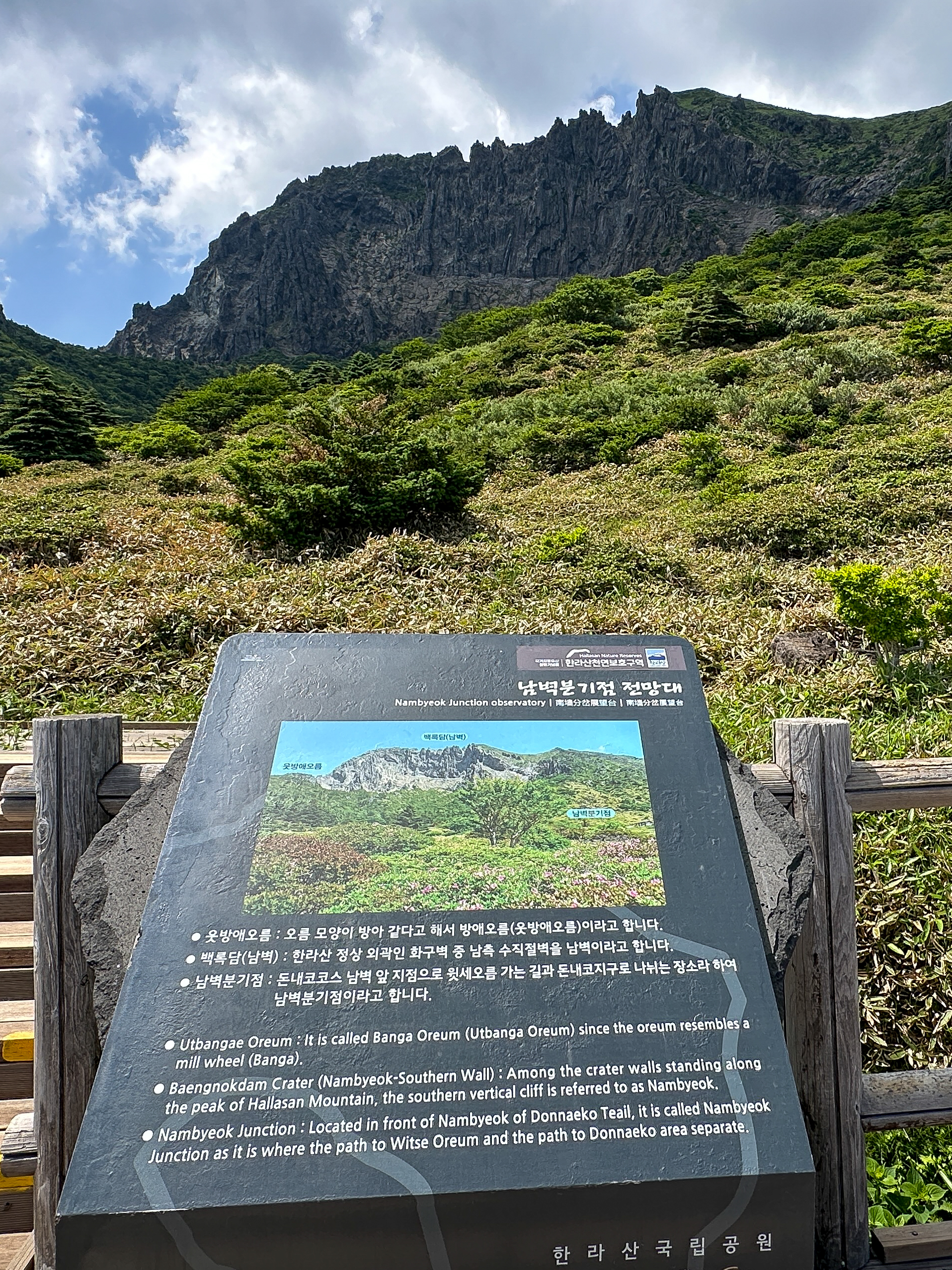 휴식을 할 수 있는 방아오름전망대에는 앞에 보이는 '백록담남벽' 안내표지판이 있다.