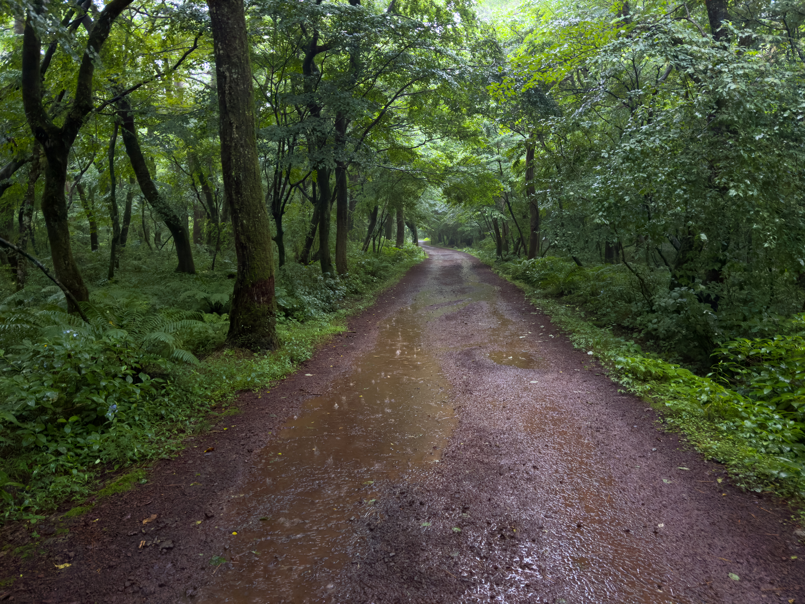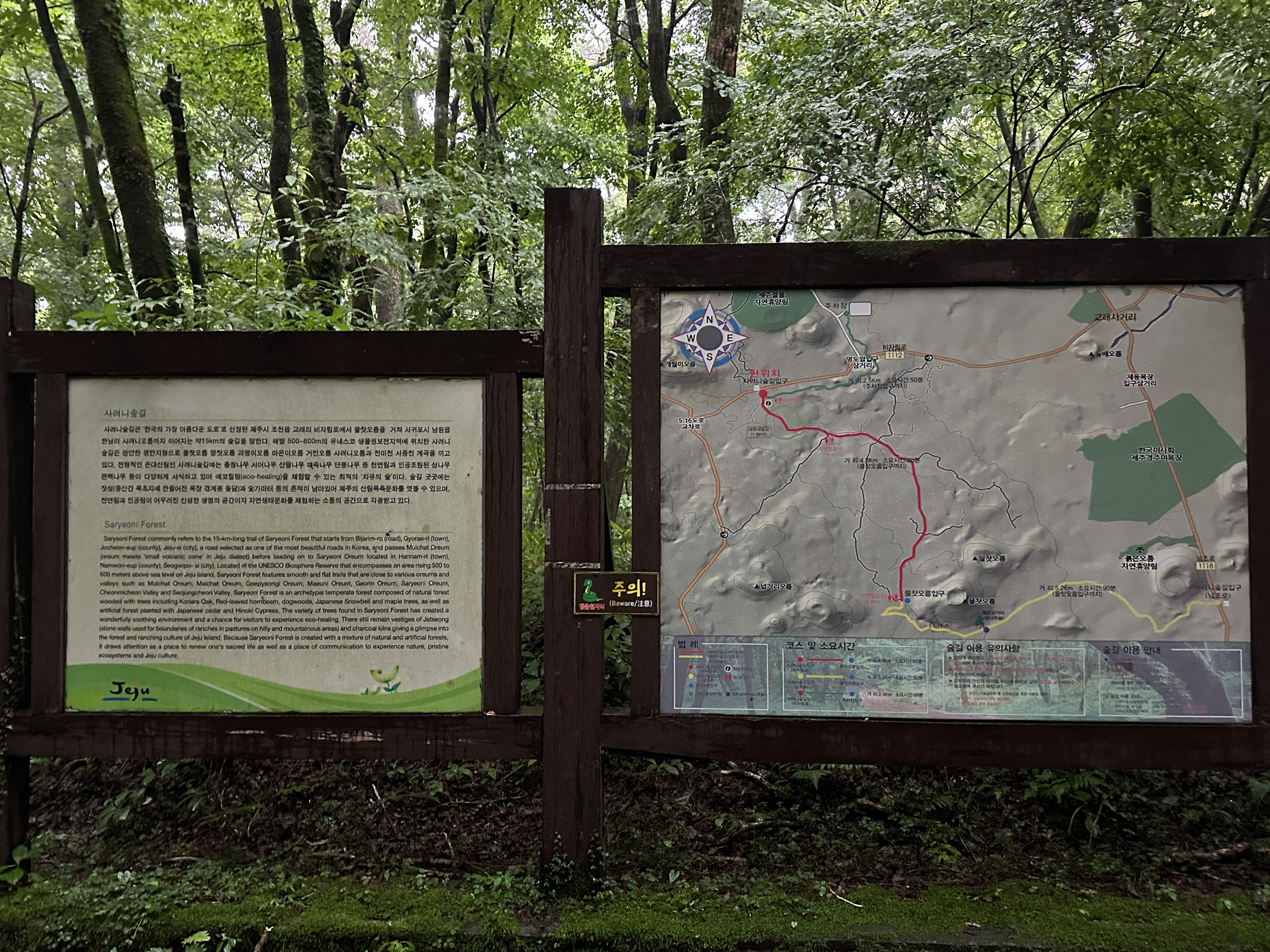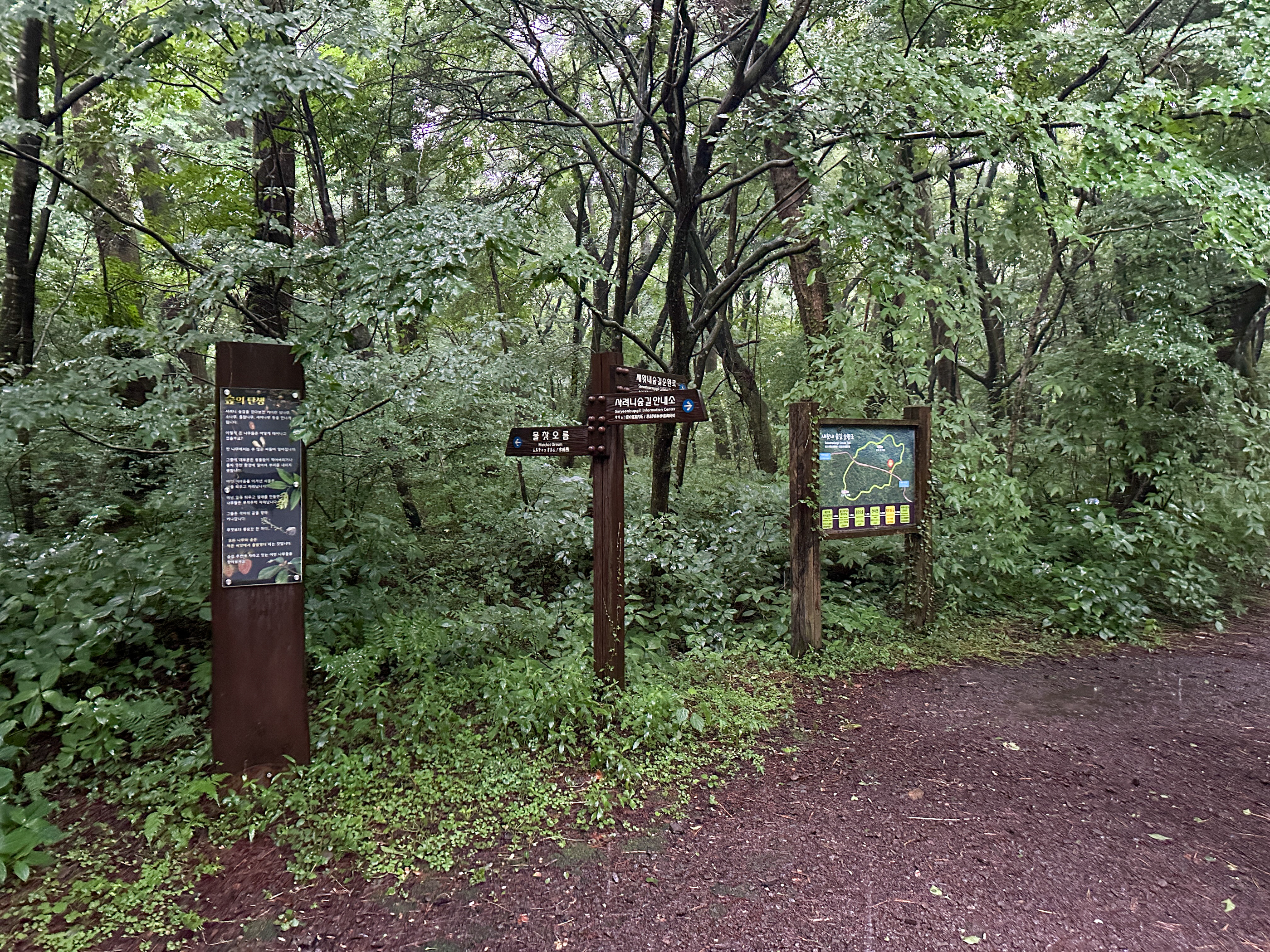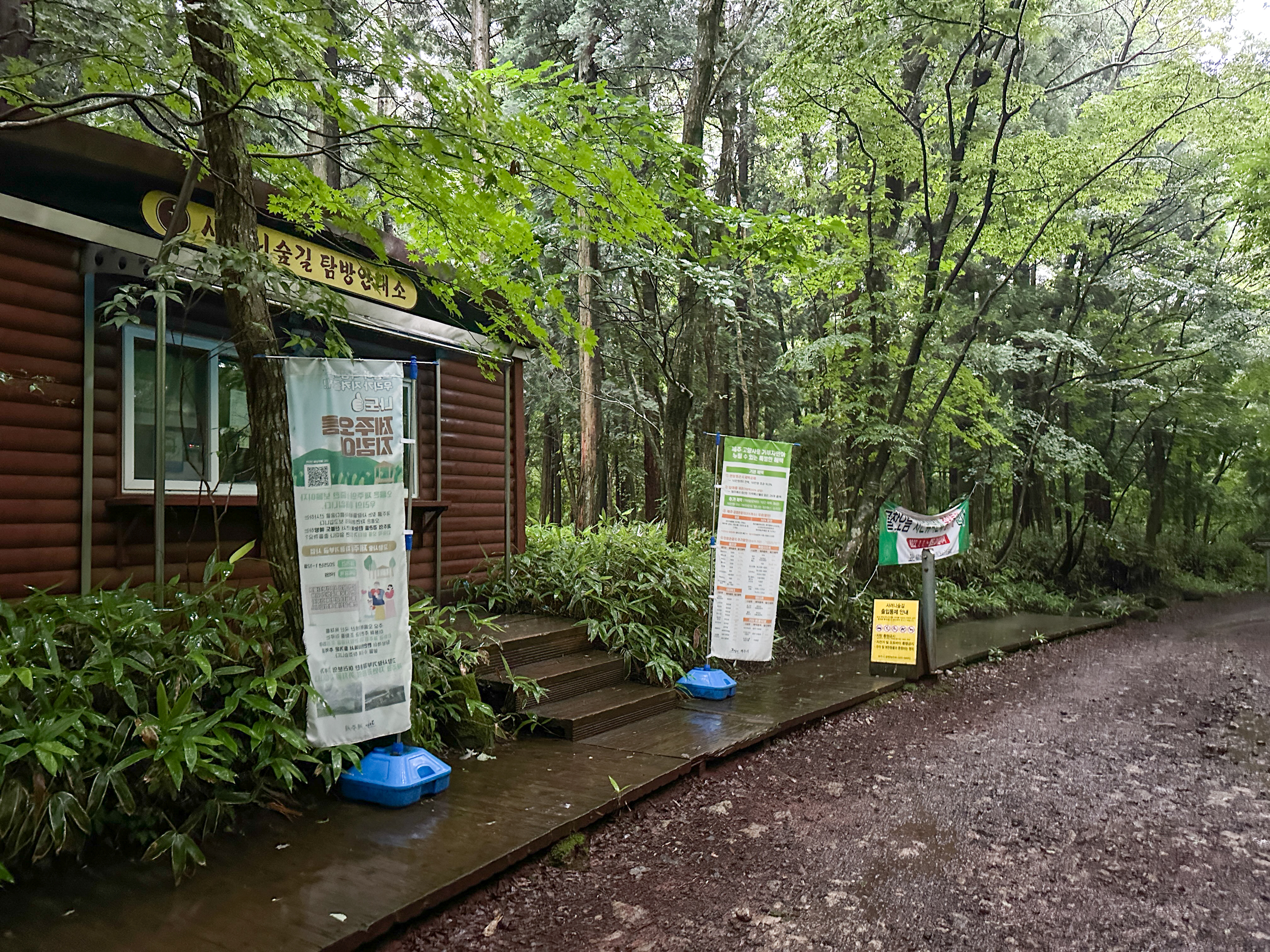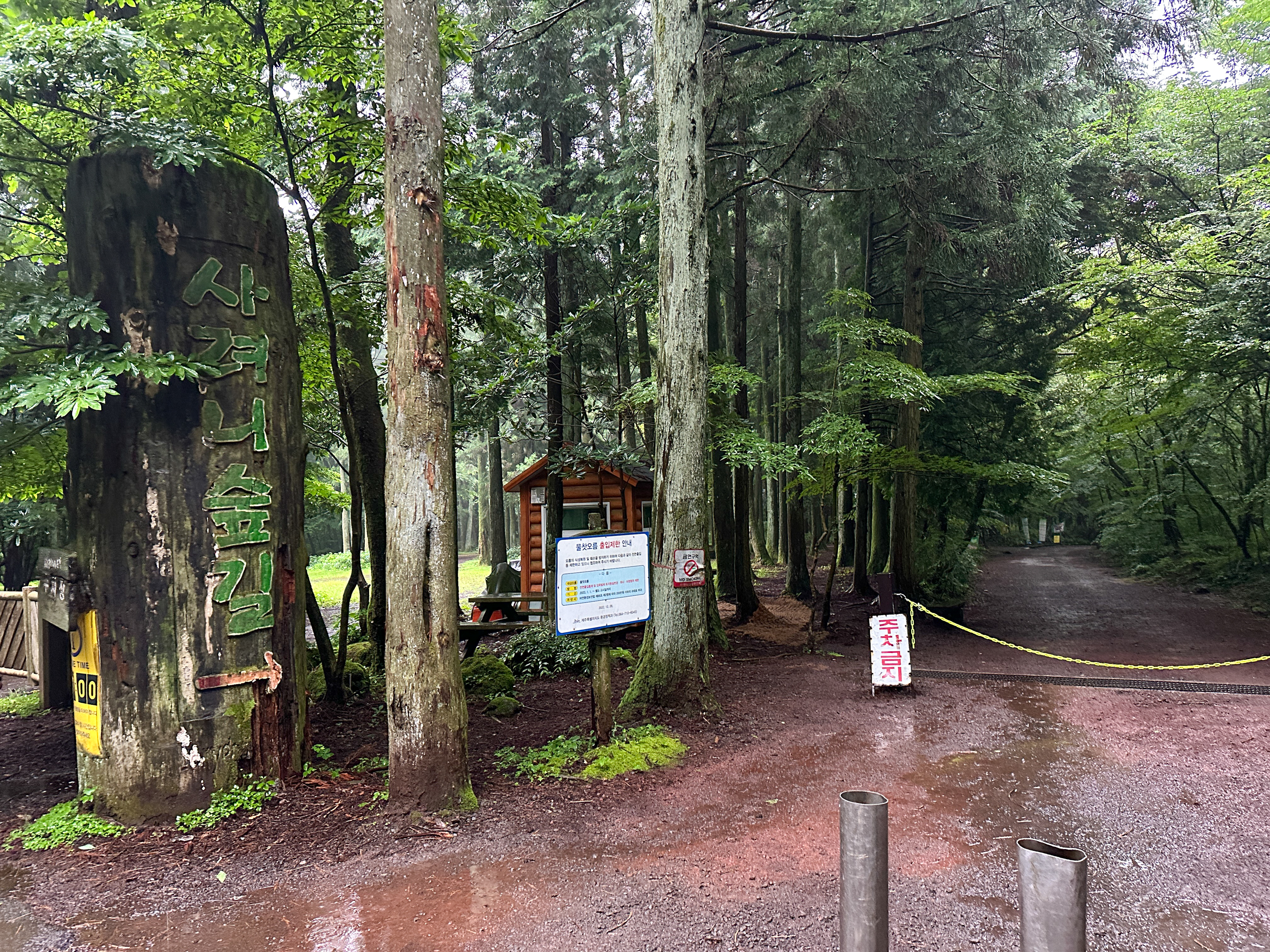 그래도 여기까지 온 시간이 아쉬워 우비를 챙겨입고 숲길을 걷기 시작했지만