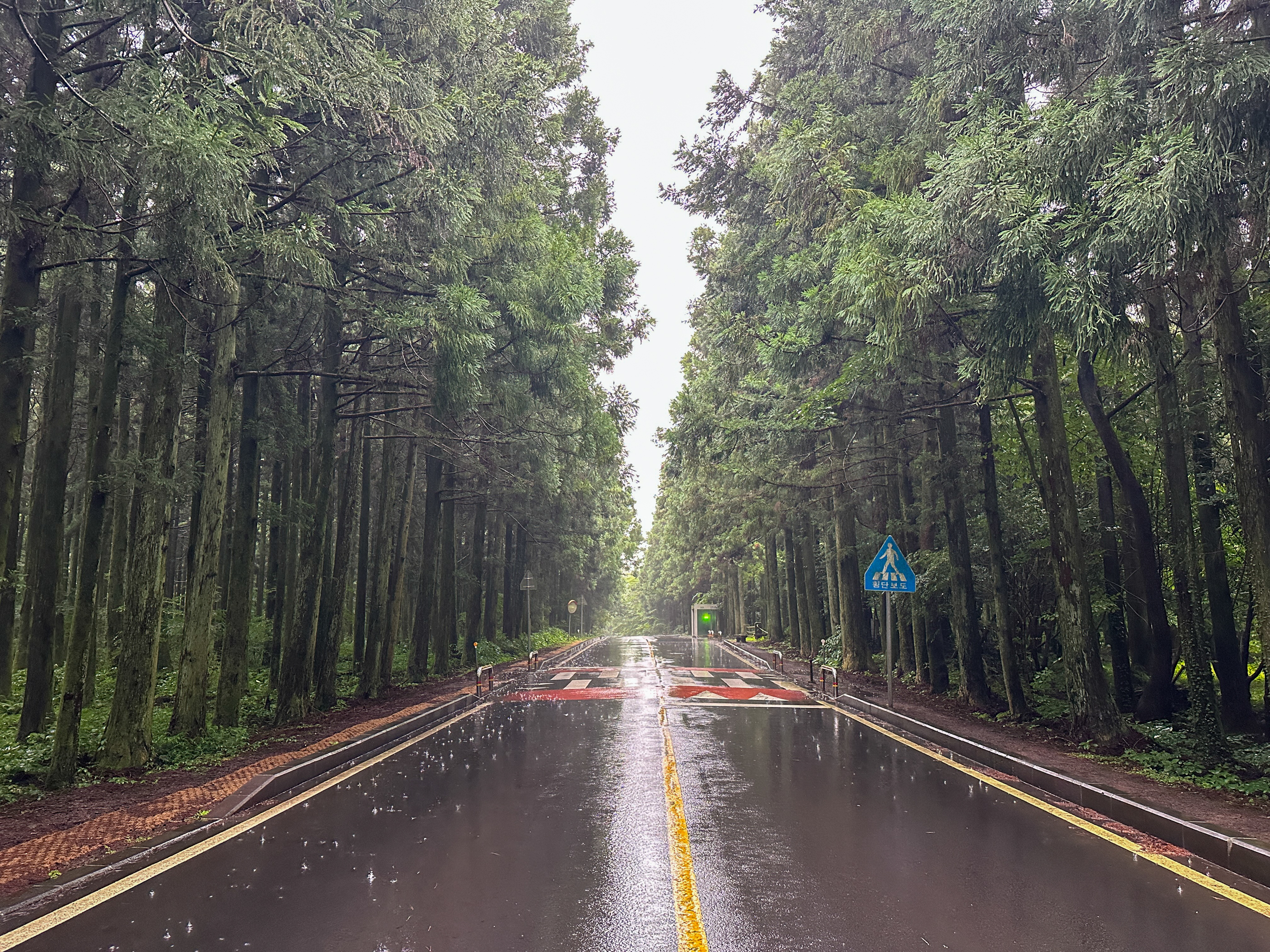 버스를 기다리며 비오는 숲속의 도로를 찍었다.