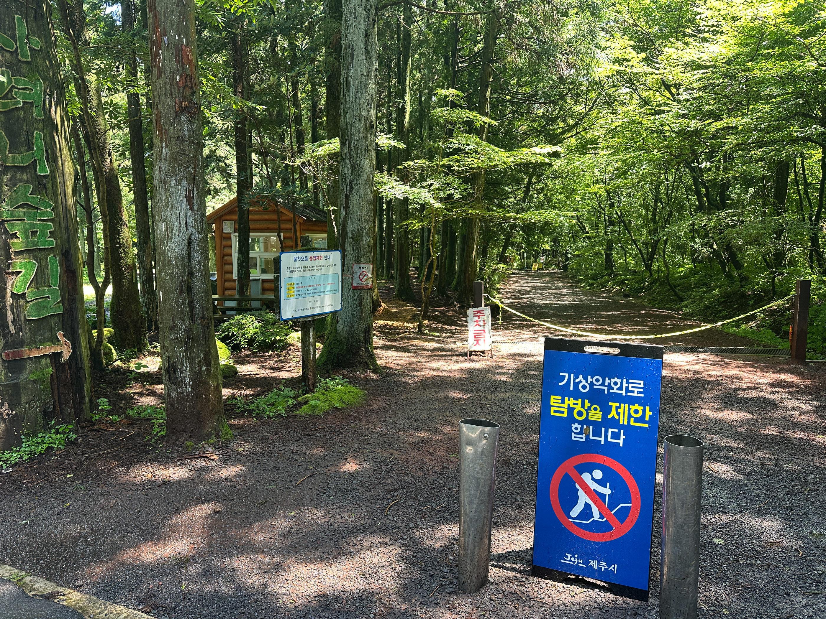 사려니숲길 입구에는 '기상악화로 탐방을 제한합니다'라는 표지판에 세워져 있었다.