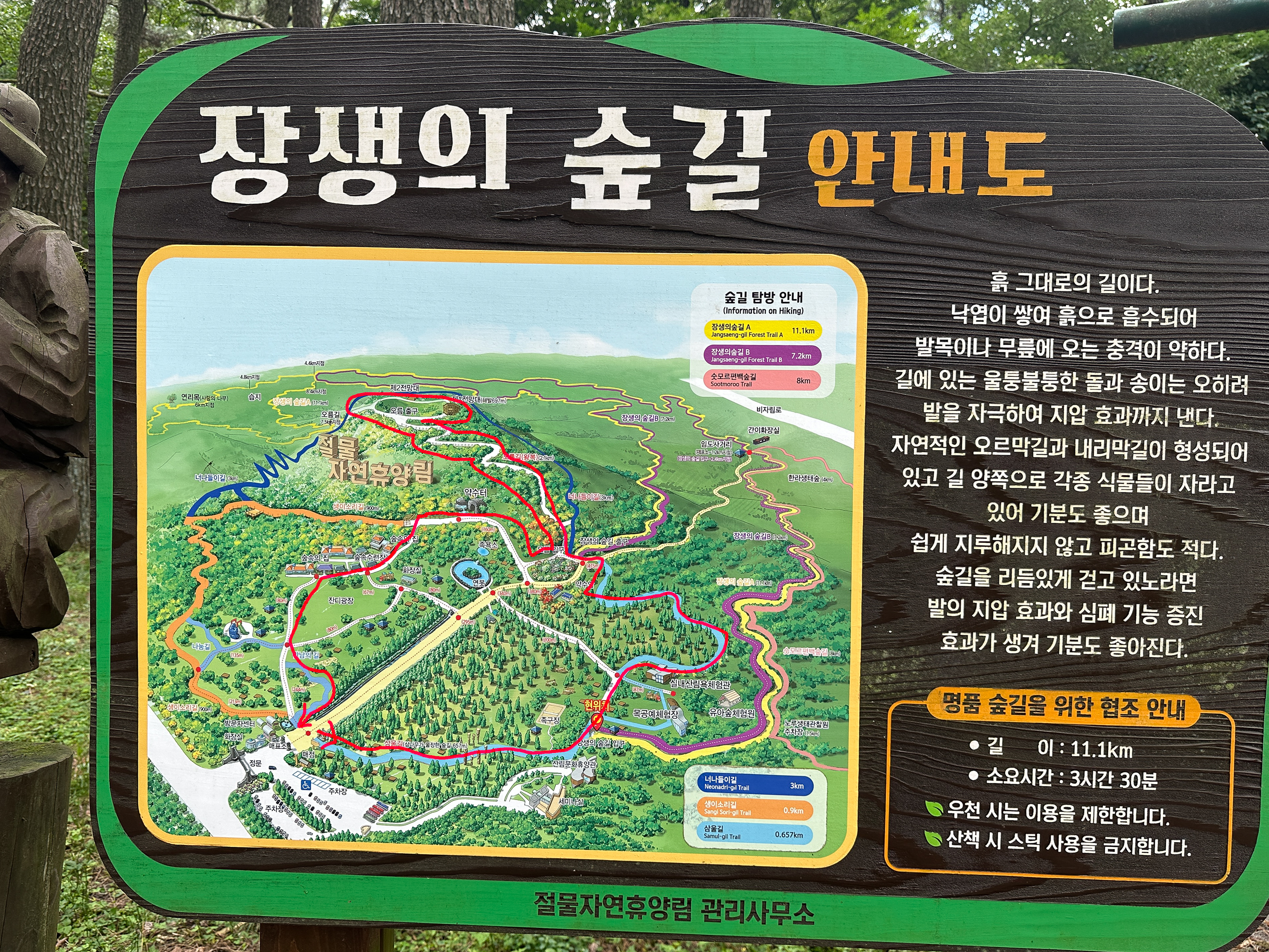 우측 '장생의숲길'은 둘레길로 이어지는 곳이다. 오늘은 왼편 길로 올라간다. 붉은 선이 오늘 우리가 걸은 길이다.