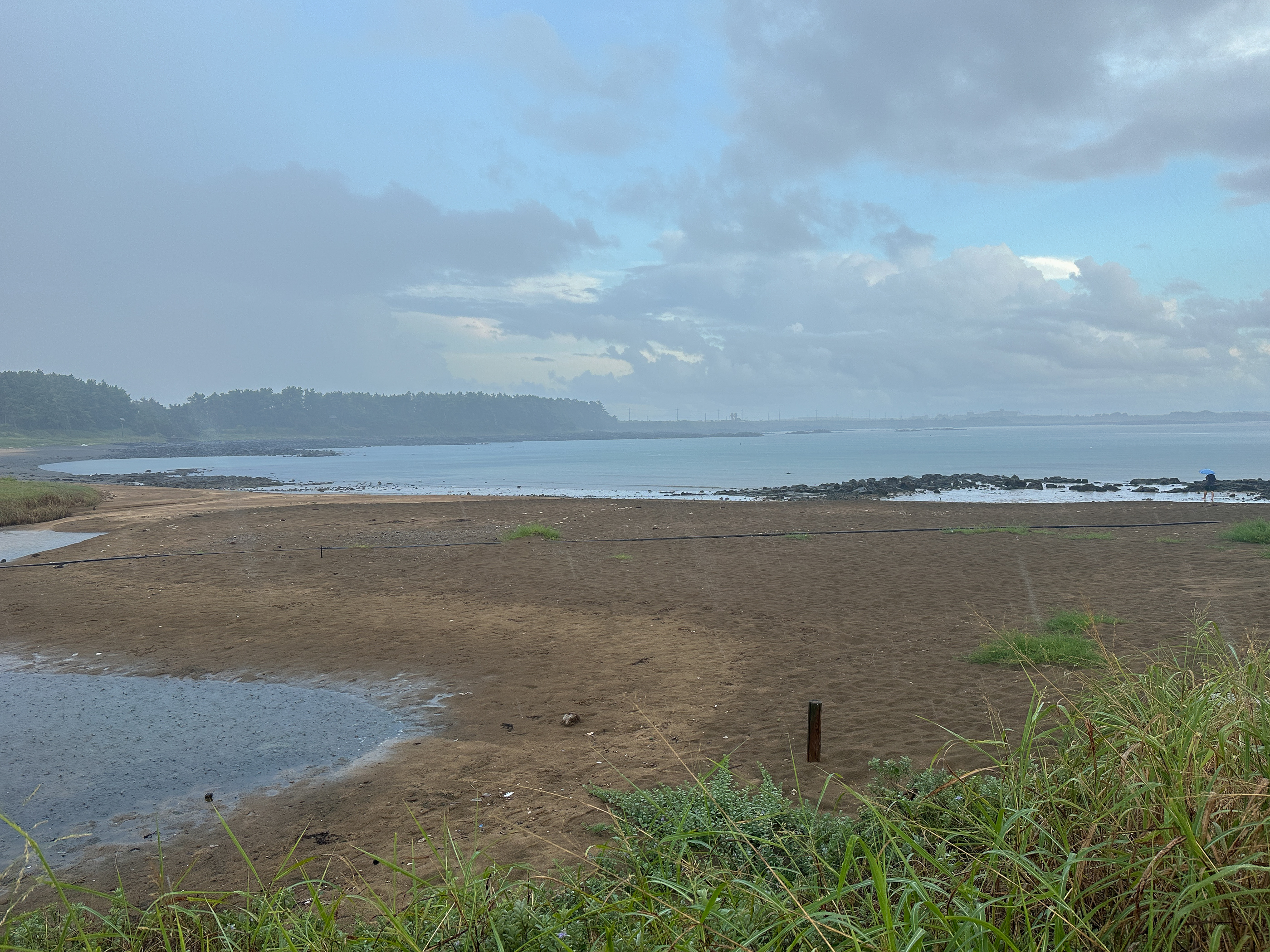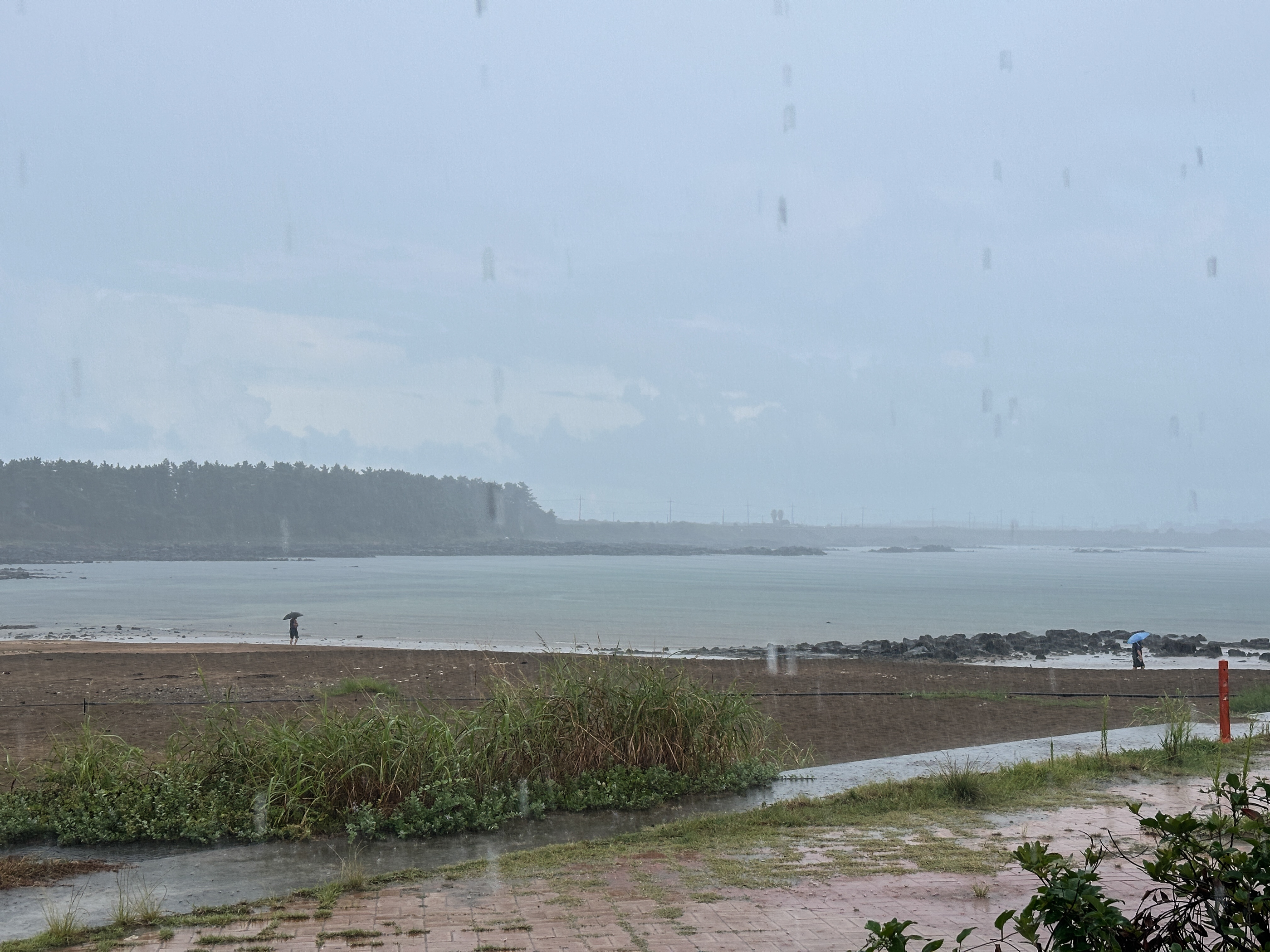 비 오는 하모해변 -우산을 쓰고 걷는 사람들이 보인다.-