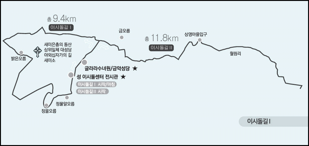 '이시돌길Ⅰ'은 '성이시돌센터전시관'에서 '금악성당'을 거쳐 밝은오름, 정물오름을 오른 후