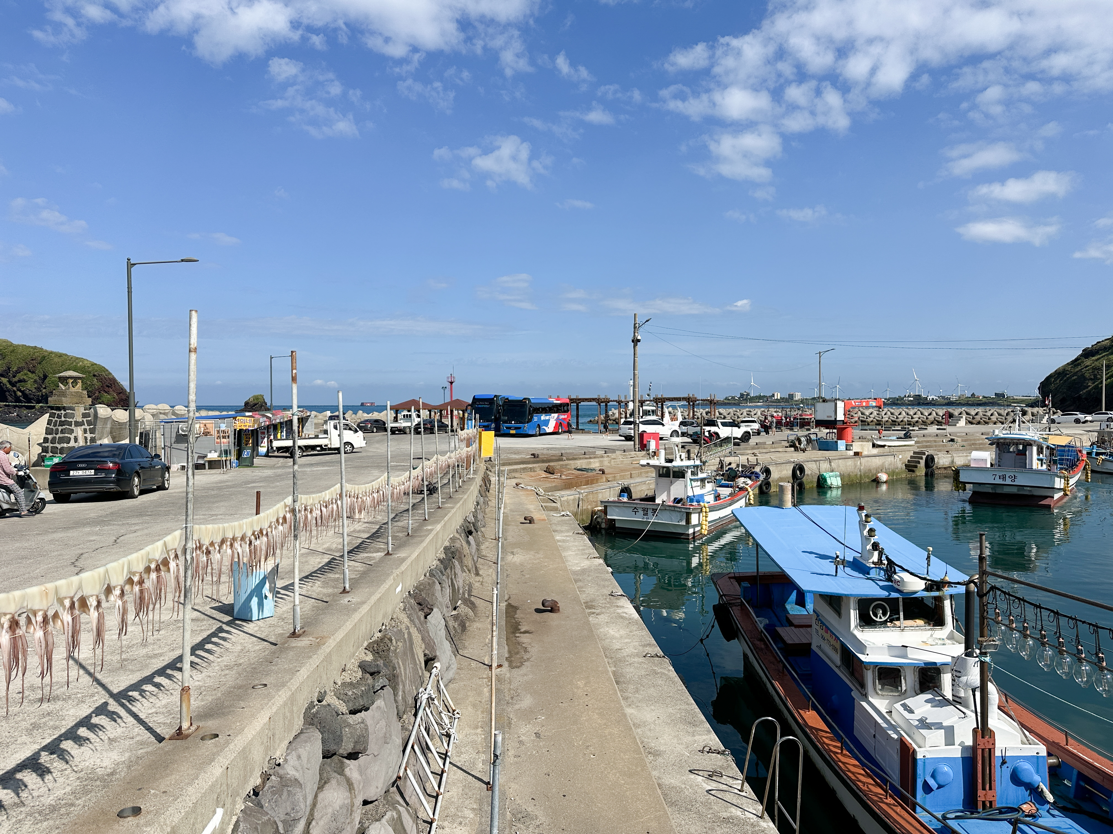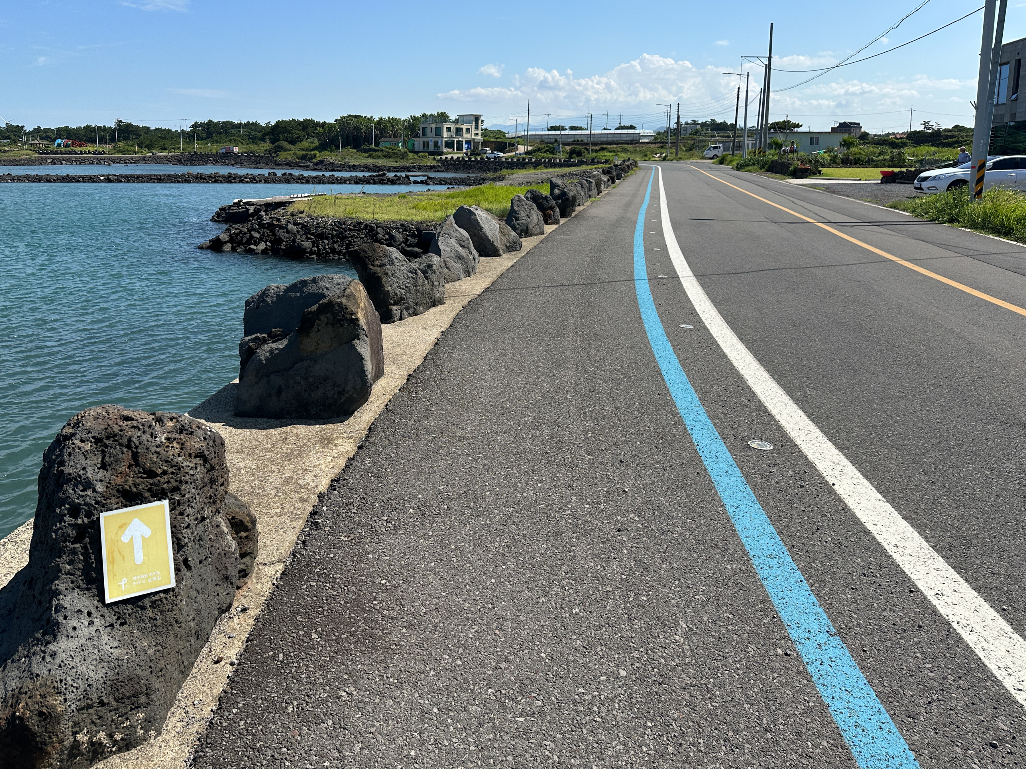 '용수포구'에서 좌회전 한 후 해안도로를 걷는다. 종점인 '신창성당'까지 올레길과 겹쳐지는 곳은 없다.