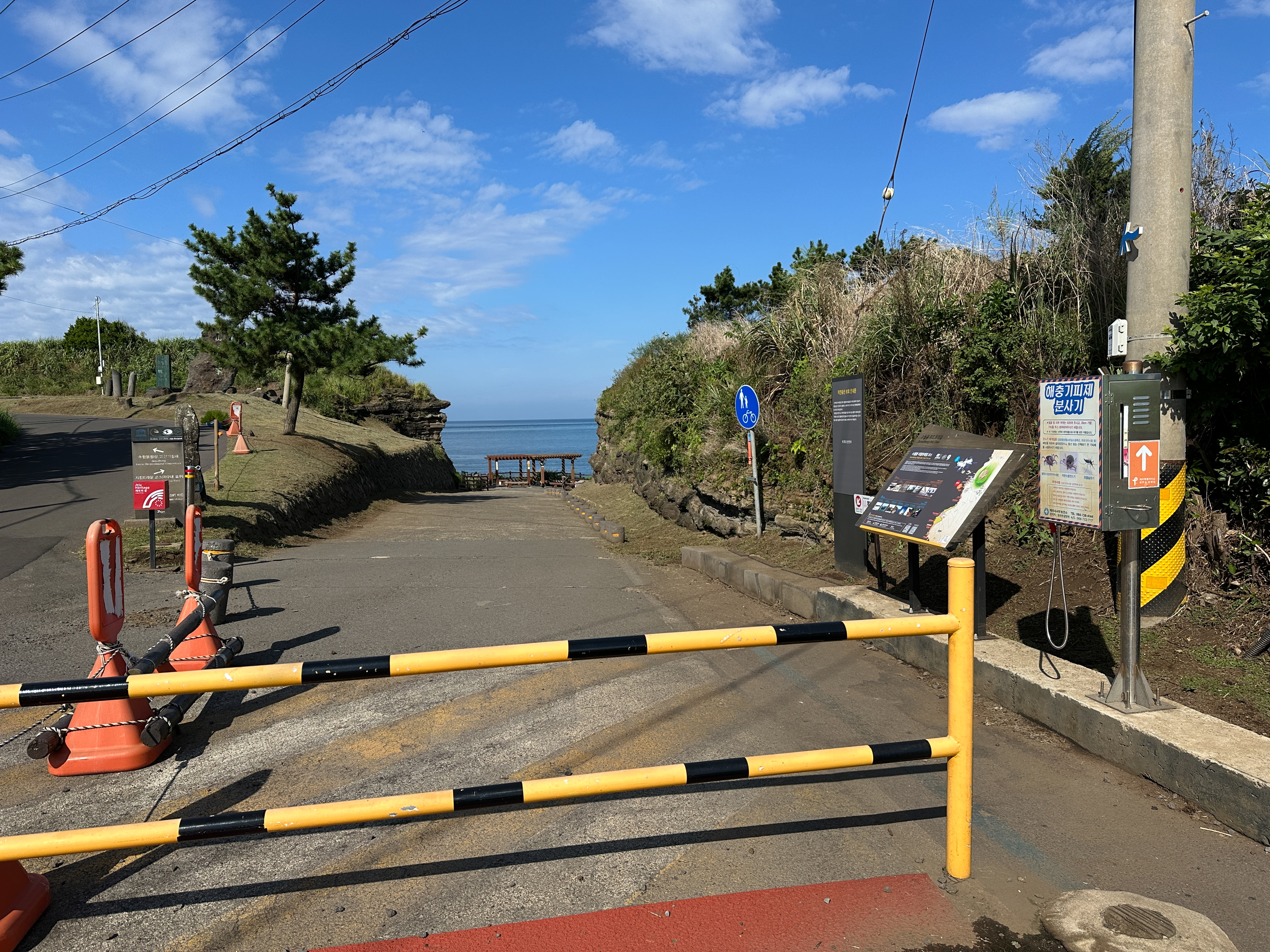 수월봉입구에 도착했다. 13분 40초, 1.1km를 걸었다. 수월봉은 왼 편, 순례길은 지질트레일코스로 직진이다. 올레12코스다.