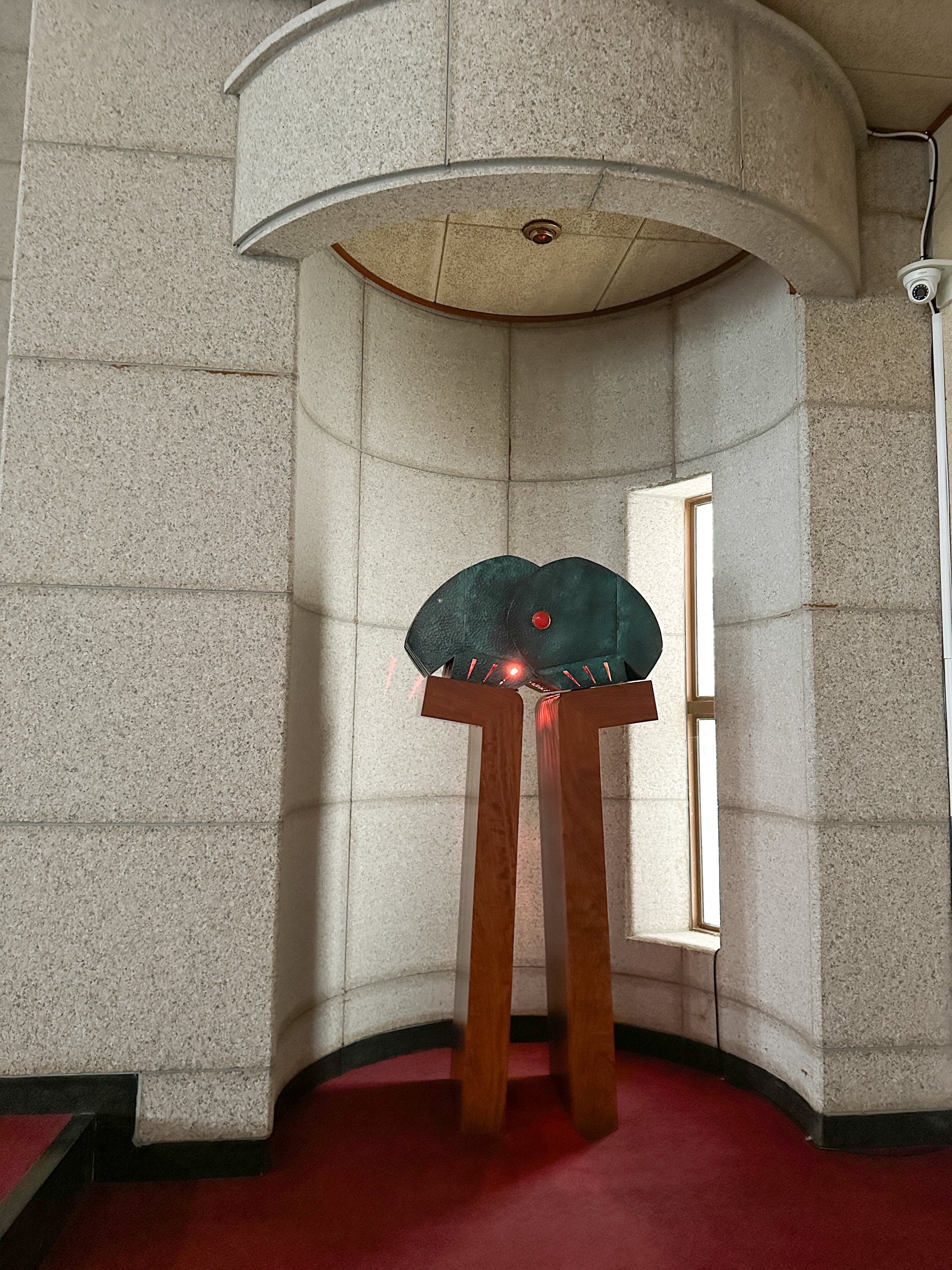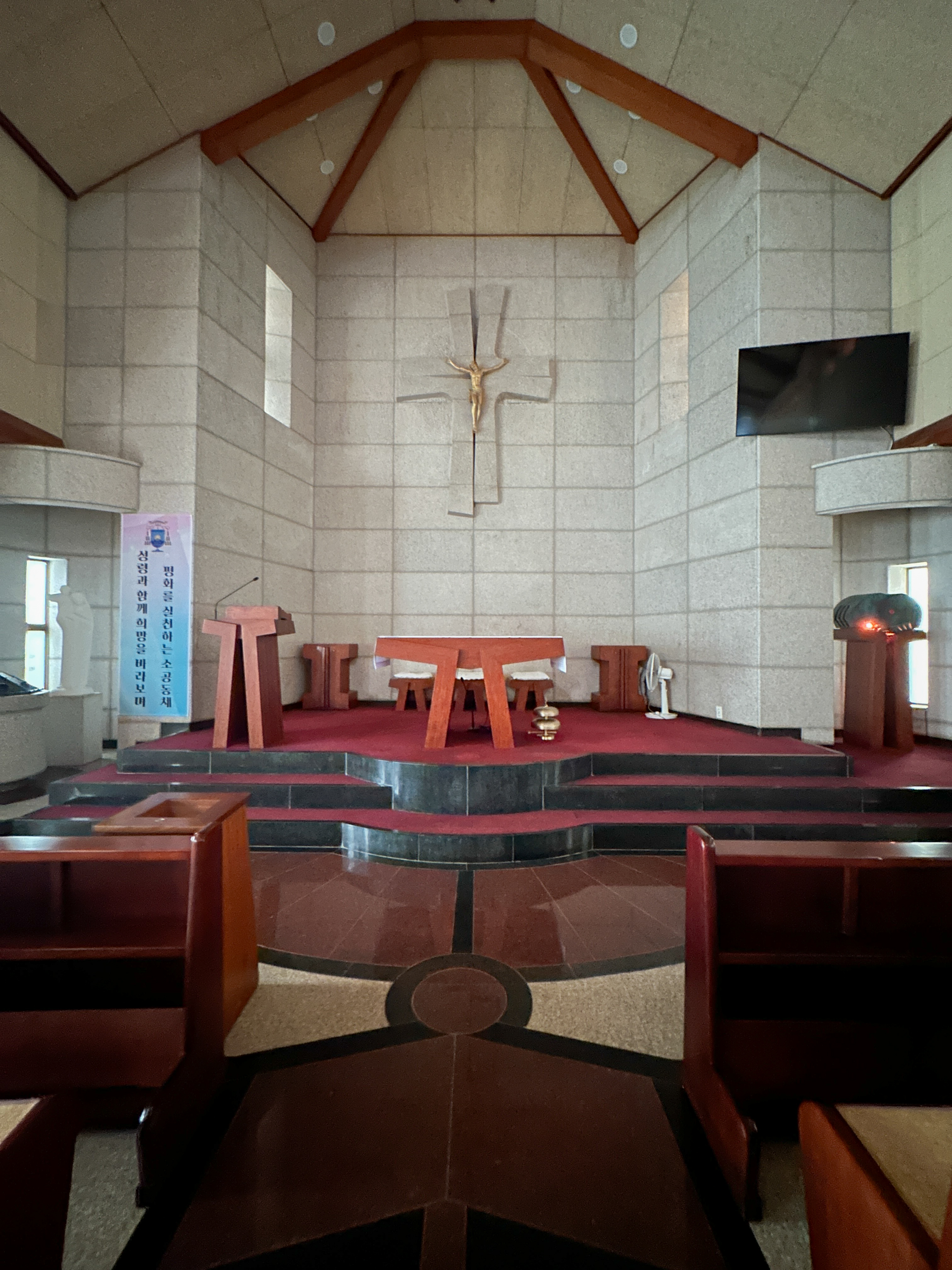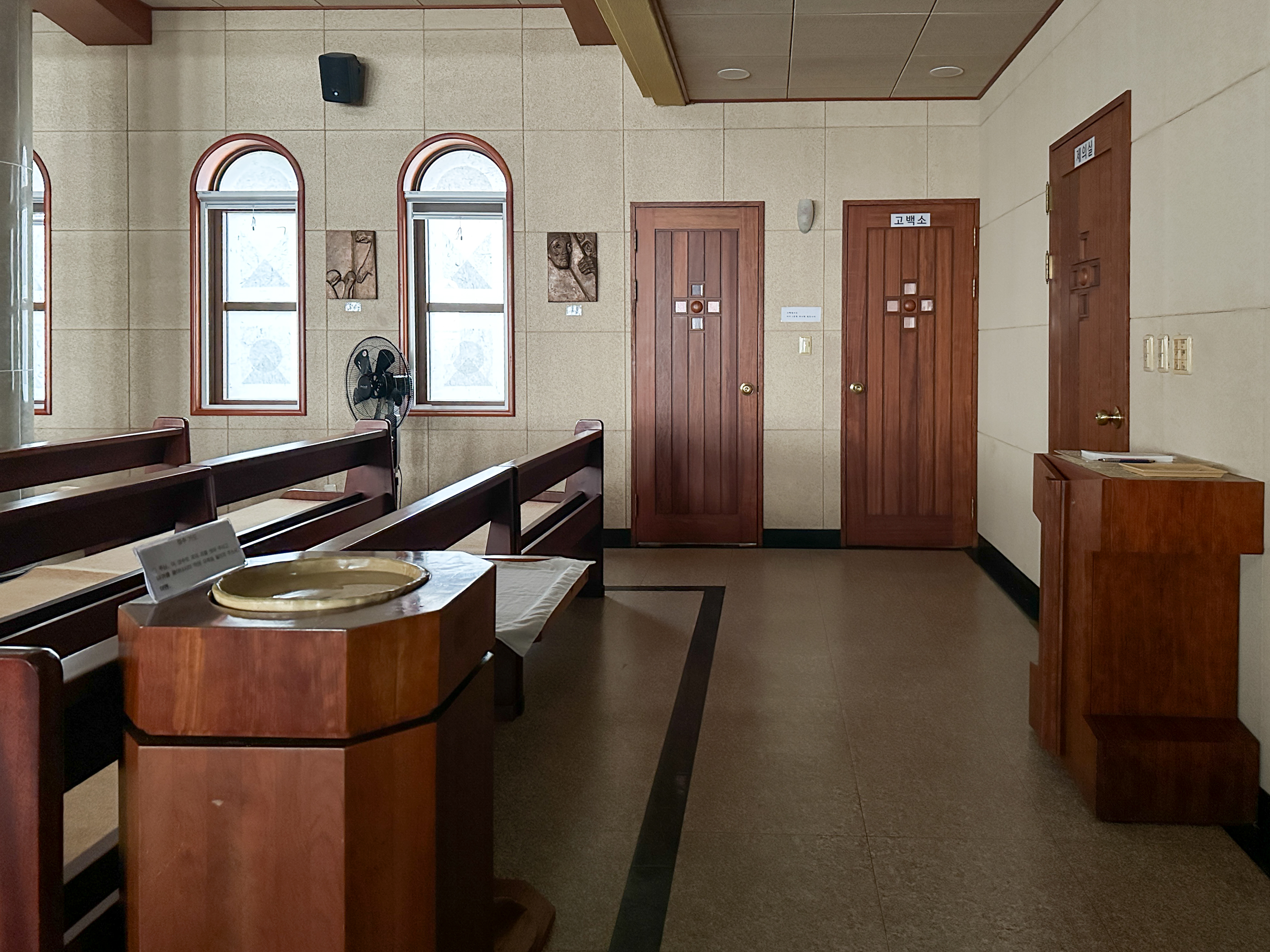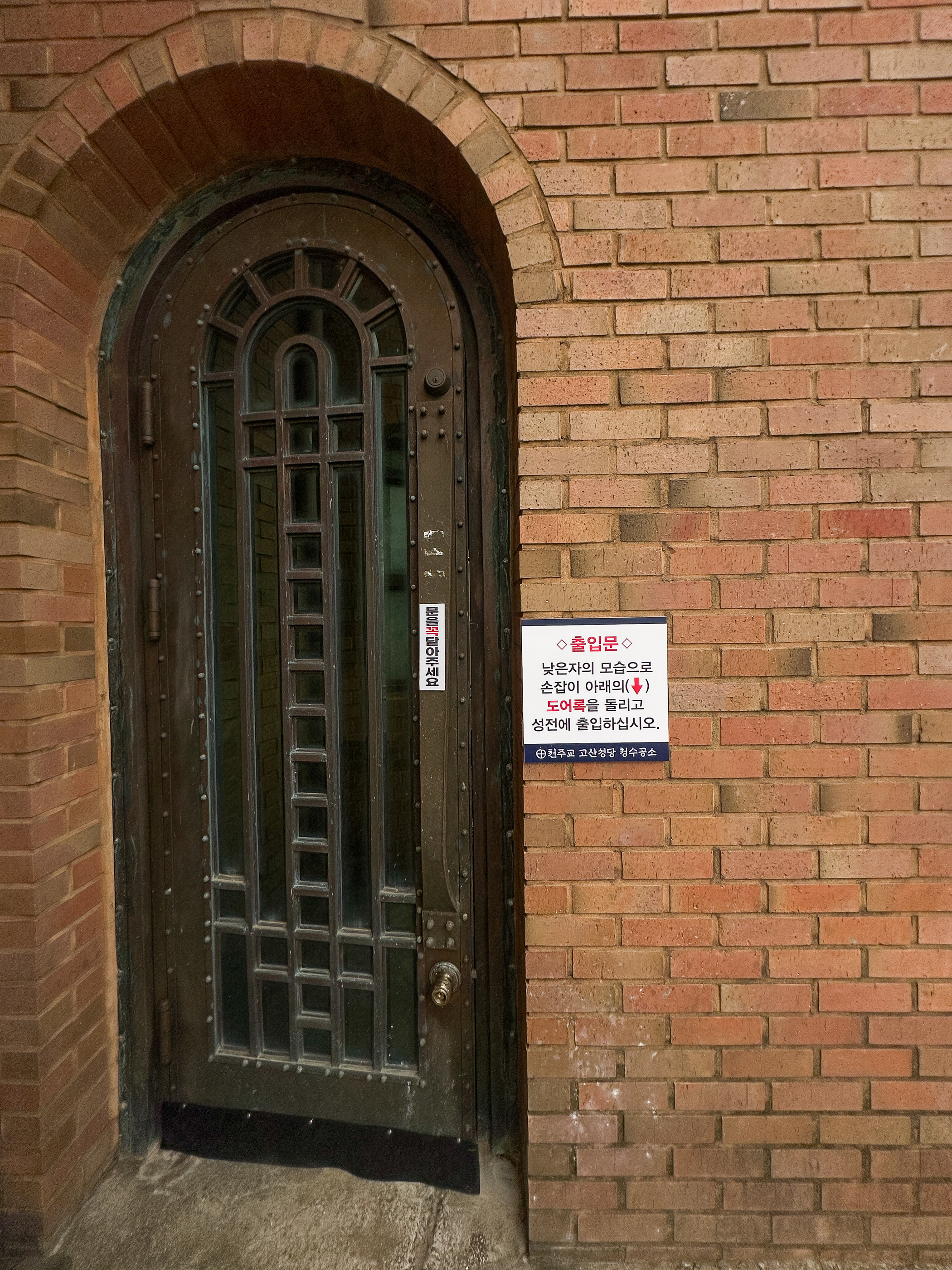 성전 왼쪽편으로 출입문이 있는데 손잡이가 아래쪽에 있다. 안내문이 인상적이다. 문을 열고 들어 온 내부다.
