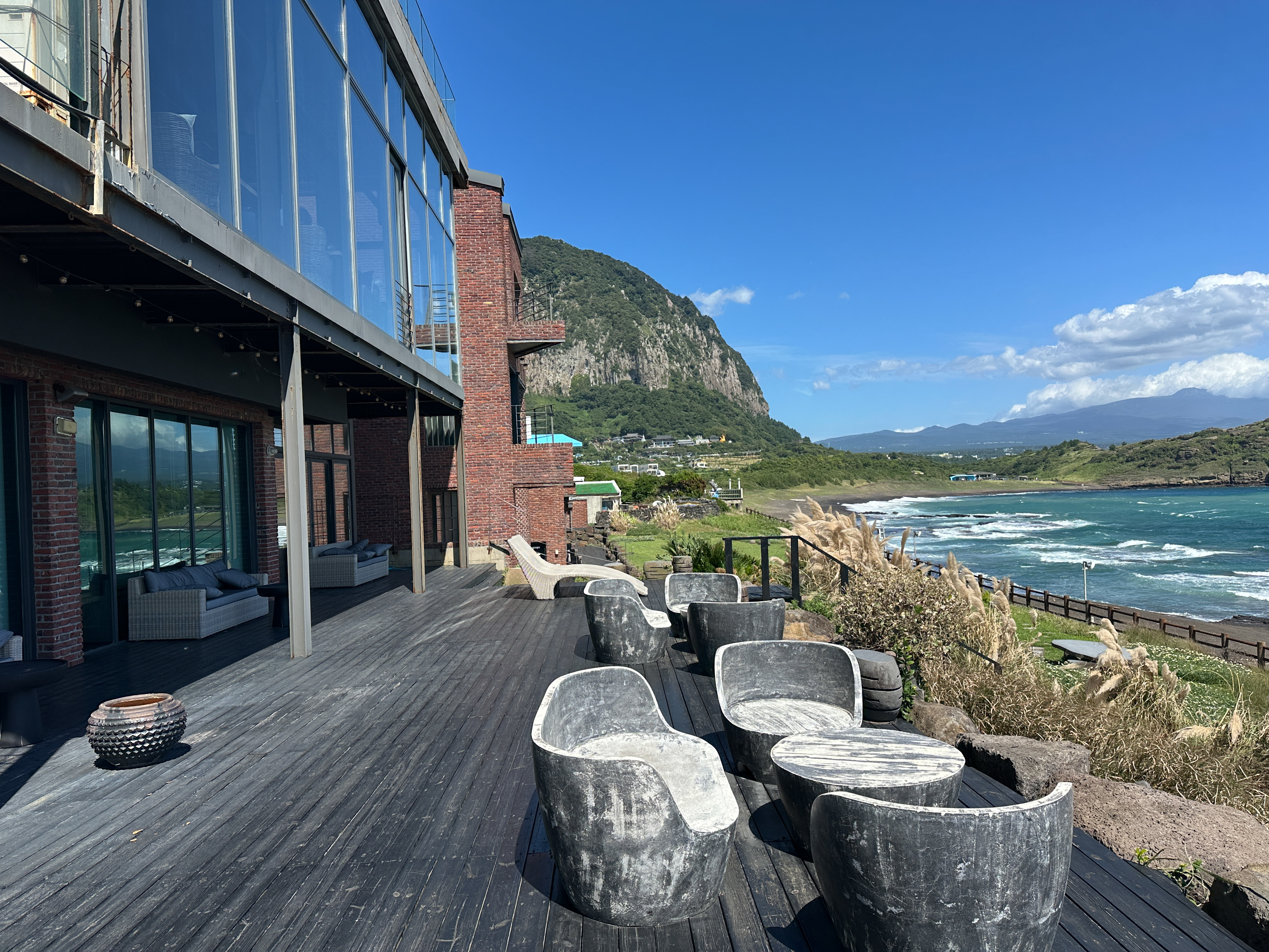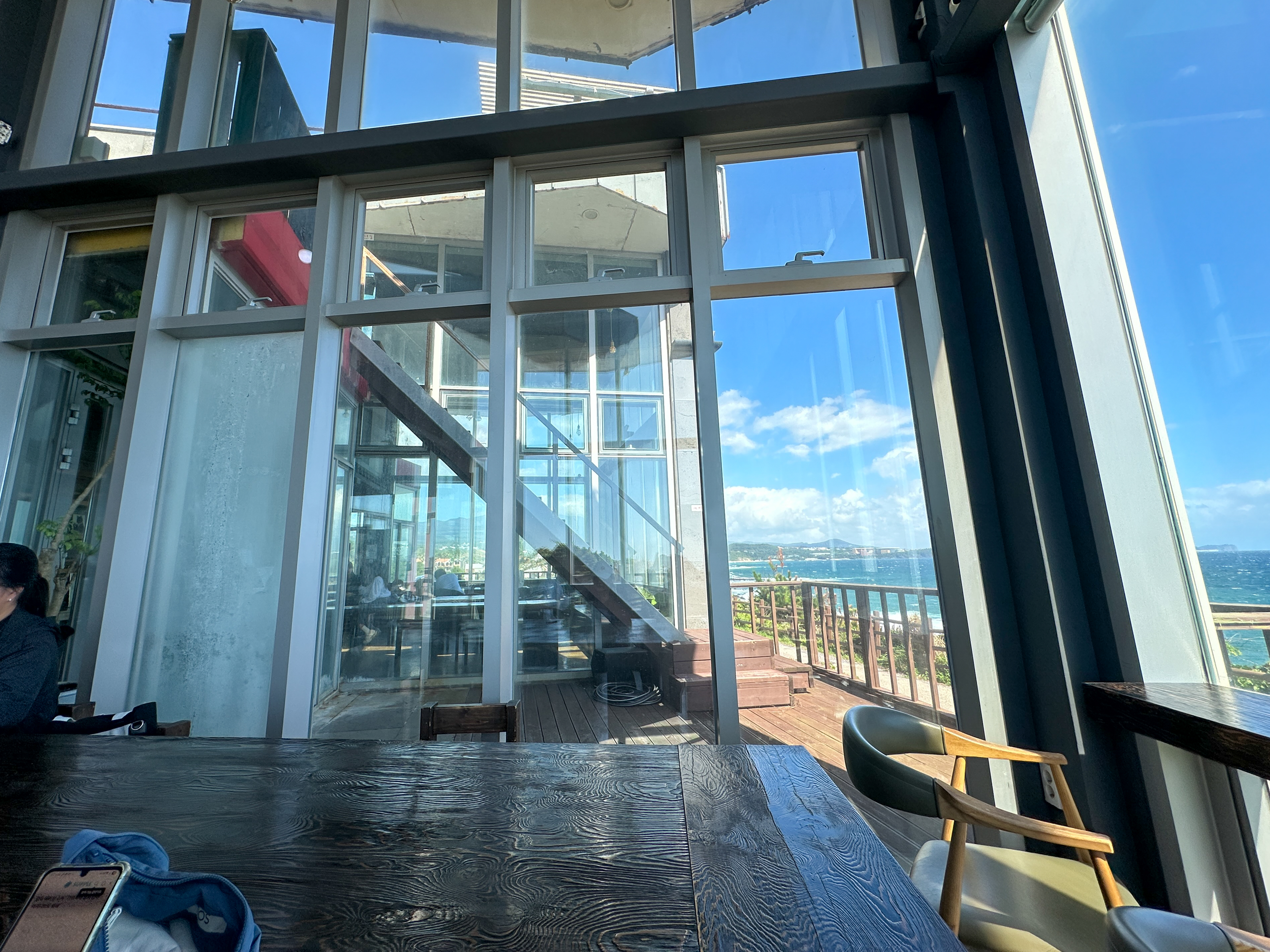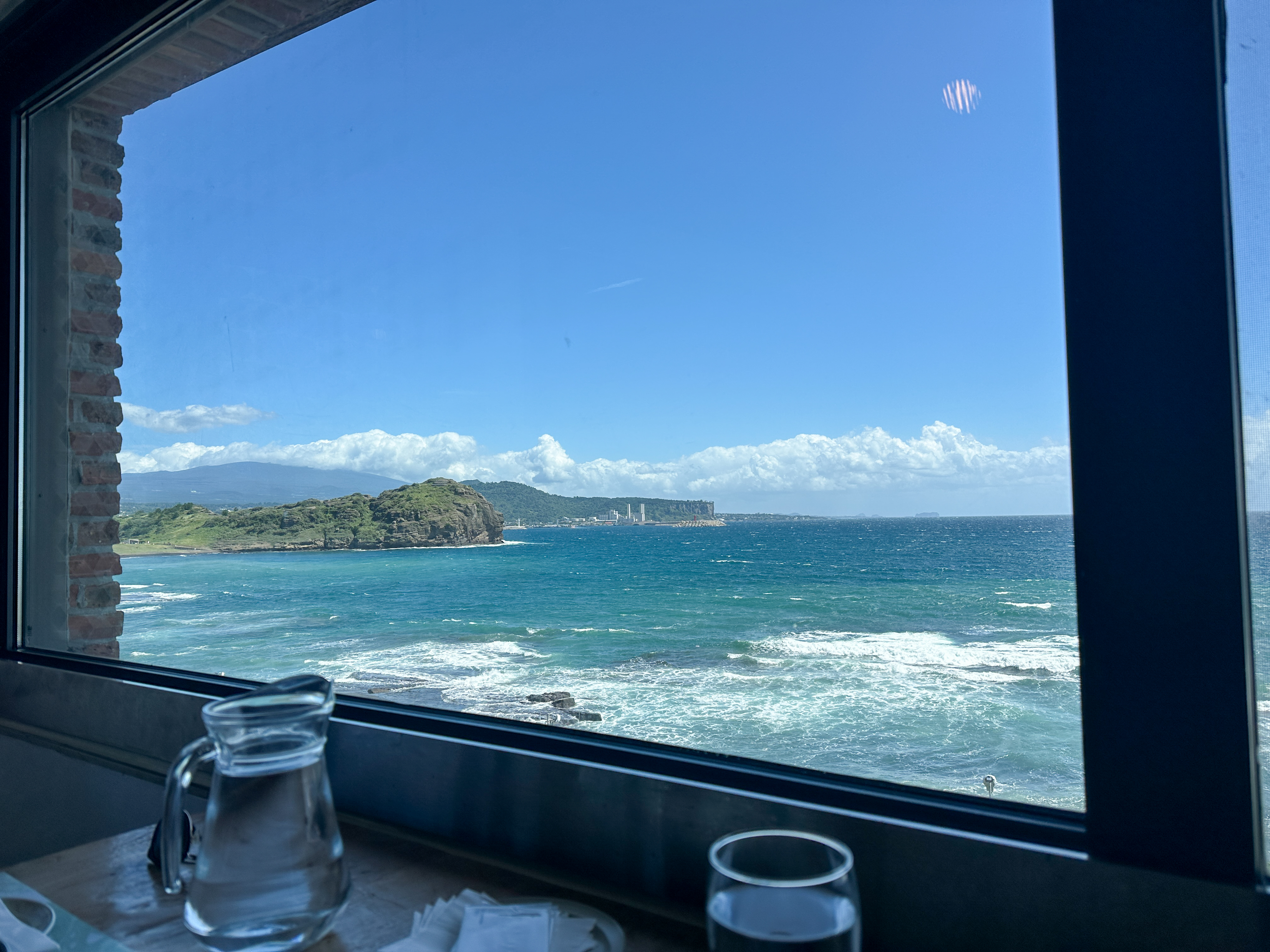 우리는 룸처럼 독립된 자리를 안내 받았다. 식탁에선 용머리와 박수기정, 형제섬도 잘 보인다.